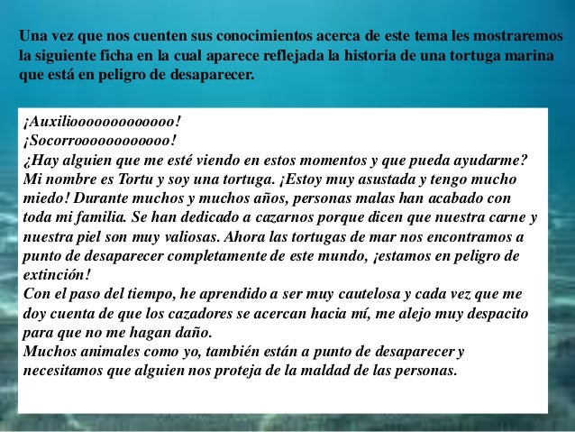 7. 7. Una vez que nos cuenten sus conocimientos acerca de este tema les mostraremosla siguiente ficha en la cual aparece reflejada la historia de una tortuga marinaque está en peligro de desaparecer.¡Auxiliooooooooooooo!¡Socorroooooooooooo!¿Hay alguien que me esté viendo en estos momentos y que pueda ayudarme?Mi nombre es Tortu y soy una tortuga. ¡Estoy muy asustada y tengo muchomiedo! Durante muchos y muchos años, personas malas han acabado contoda mi familia. Se han dedicado a cazarnos porque dicen que nuestra carne ynuestra piel son muy valiosas. Ahora las tortugas de mar nos encontramos apunto de desaparecer completamente de este mundo, ¡estamos en peligro deextinción!Con el paso del tiempo, he aprendido a ser muy cautelosa y cada vez que medoy cuenta de que los cazadores se acercan hacia mí, me alejo muy despacitopara que no me hagan daño.Muchos animales como yo, también están a punto de desaparecer ynecesitamos que alguien nos proteja de la maldad de las personas.