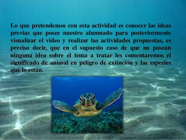 8. 8. Lo que pretendemos con esta actividad es conocer las ideasprevias que posee nuestro alumnado para posteriormentevisualizar el video y realizar las actividades propuestas, espreciso decir, que en el supuesto caso de que no poseanninguna idea sobre el tema a tratar les comentaremos elsignificado de animal en peligro de extinción y las especiesque lo están.