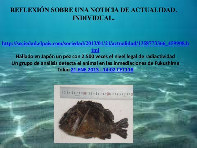 9. 9. REFLEXIÓN SOBRE UNA NOTICIA DE ACTUALIDAD. INDIVIDUAL.http://sociedad.elpais.com/sociedad/2013/01/21/actualidad/1358773366_459908.h tml Hallado en Japón un pez con 2.500 veces el nivel legal de radiactividad Un grupo de análisis detecta el animal en las inmediaciones de Fukushima Tokio 21 ENE 2013 - 14:02 CET118
