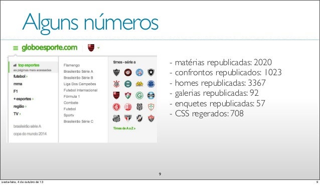 10. 10. Alguns números 9 - matérias republicadas: 2020 - confrontos republicados: 1023 - homes republicadas: 3367 - galerias republicadas: 92 - enquetes republicadas: 57 - CSS regerados: 708 9sexta-feira, 4 de outubro de 13