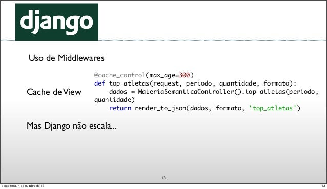 14. 14. 13 Uso de Middlewares Cache deView Mas Django não escala... @cache_control(max_age=300) def top_atletas(request, periodo, quantidade, formato): dados = MateriaSemanticaController().top_atletas(periodo, quantidade) return render_to_json(dados, formato, 'top_atletas') 13sexta-feira, 4 de outubro de 13