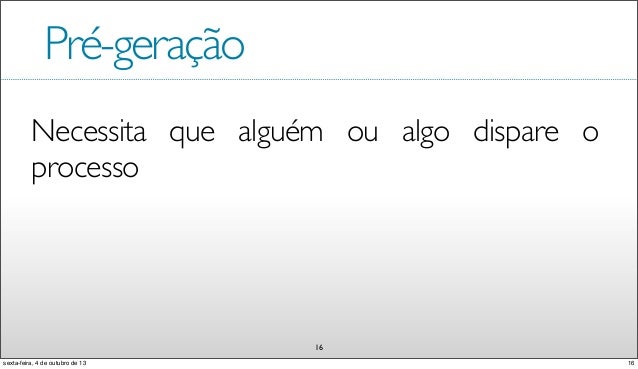 17. 17. Pré-geração Necessita que alguém ou algo dispare o processo 16 16sexta-feira, 4 de outubro de 13