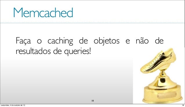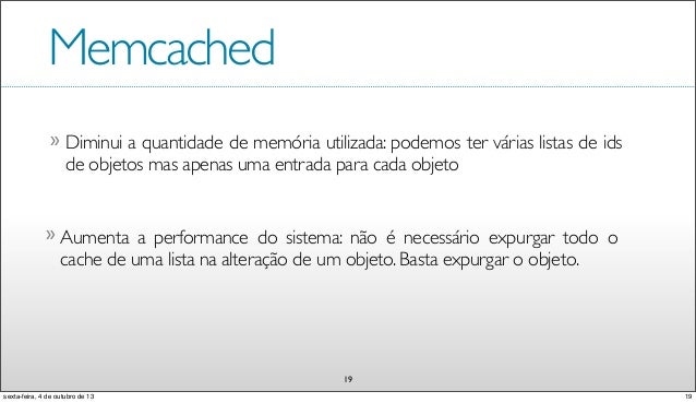 19. 19. Memcached Faça o caching de objetos e não de resultados de queries! 18 18sexta-feira, 4 de outubro de 13