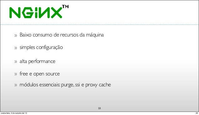 24. 24. Baixo consumo de recursos da máquina» 23 simples configuração» alta performance» free e open source» módulos essenciais: purge, ssi e proxy cache» 23sexta-feira, 4 de outubro de 13