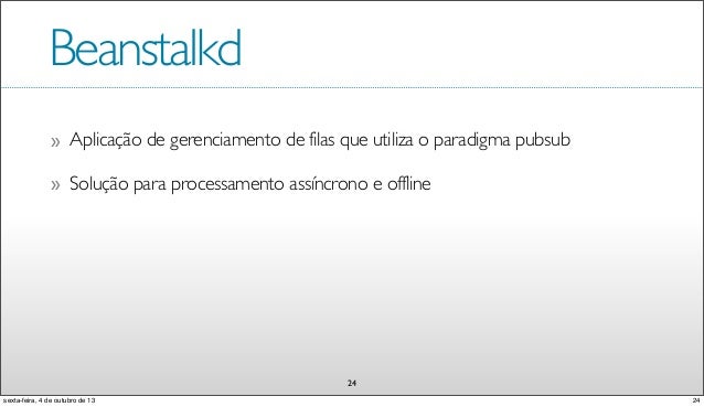 25. 25. Beanstalkd Aplicação de gerenciamento de filas que utiliza o paradigma pubsub» 24 Solução para processamento assíncrono e offline» 24sexta-feira, 4 de outubro de 13