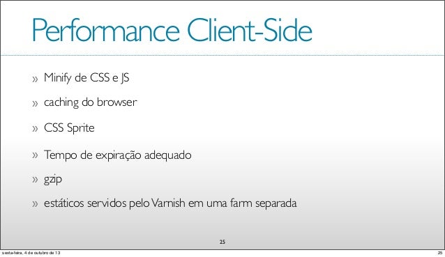 26. 26. Minify de CSS e JS» 25 CSS Sprite» Tempo de expiração adequado» gzip» estáticos servidos peloVarnish em uma farm separada» Performance Client-Side caching do browser» 25sexta-feira, 4 de outubro de 13