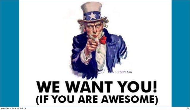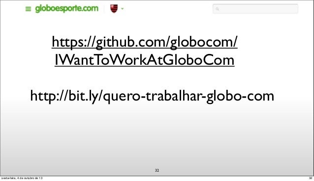 33. 33. 32 https://github.com/globocom/ IWantToWorkAtGloboCom http://bit.ly/quero-trabalhar-globo-com 32sexta-feira, 4 de outubro de 13