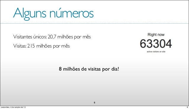 9. 9. Alguns números Visitantes únicos: 20,7 milhões por mês 8 Visitas: 215 milhões por mês 8 milhões de visitas por dia! 8sexta-feira, 4 de outubro de 13