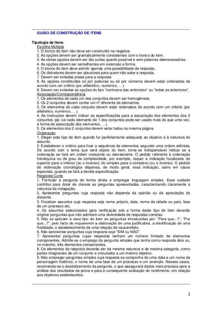 2. 2. GUIÃO DE CONSTRUÇÃO DE ITENSTipologia de Itens Escolha Múltipla 1. O tronco do item não deve ser construído na negativa. 2. As opções devem ser gramaticalmente consistentes com o tronco do item. 3. As várias opções devem ser tão curtas quanto possível e sem palavras desnecessárias. 4. As opções devem ser semelhantes em extensão e forma. 5. O tronco do item deve admitir apenas uma possibilidade de resposta. 6. Os distratores devem ser plausíveis para quem não sabe a resposta. 7. Devem ser evitadas pistas para a resposta. 8. As opções constituídas só por palavras ou só por números devem estar ordenadas de acordo com um critério (pe: alfabético, numérico, …). 9. Devem ser evitadas as opções do tipo “nenhuma das anteriores” ou “todas as anteriores”. Associação/Correspondência 1. Os elementos de cada um dos conjuntos devem ser homogéneos. 2. Os 2 conjuntos devem conter um nº diferente de elementos. 3. Os elementos de cada conjunto devem estar ordenados de acordo com um critério (pe: alfabético, numérico, …). 4. As instruções devem indicar as especificações para a associação dos elementos dos 2 conjuntos (pe: se cada elemento de 1 dos conjuntos pode ser usado mais do que uma vez, a forma de associação dos elementos, …). 5. Os elementos dos 2 conjuntos devem estar todos na mesma página. Ordenação 1. Eleger este tipo de item quando for perfeitamente adequado ao objetivo e à natureza do assunto. 2. Estabelecer o critério para fixar a sequência de elementos segundo uma ordem definida. De acordo com o tema que será objeto do item, torna-se indispensável indicar se a ordenação se fará em ordem crescente ou decrescente. O pedido referente à ordenação hierárquica ou de grau de complexidade, por exemplo, requer a indicação focalizada: do superior para o inferior (ou o inverso); do simples para o complexo (ou o inverso). O pedido de ordenação cronológica dispensa, de modo geral, essa indicação, salvo em casos especiais, quando se fará a devida especificação. Resposta Curta 1. Formular a pergunta de forma direta e empregar linguagem simples. Esse cuidado contribui para dotar de clareza as perguntas apresentadas, caracterizando claramente a natureza da indagação. 2. Apresentar perguntas cuja resposta não dependa da opinião ou da apreciação do discente. 3. Focalizar assuntos cuja resposta seja nome próprio, data, nome da cidade ou país, fase de um processo etc. 4. Os assuntos selecionados para verificação sob a forma deste tipo de item deverão originar perguntas que não admitam uma diversidade de respostas corretas. 5. Não se aplicam a esse tipo de item as perguntas introduzidas por: “Para que...?”, “Por que...?”, pelo facto de requererem a elaboração de uma justificativa, a identificação de uma finalidade, o estabelecimento de uma relação de causa/efeito. 6. Não apresentar perguntas cuja resposta seja “SIM ou NÃO”. 7. Apresentar perguntas cujas respostas tenham um número limitado de elementos componentes. Admite-se o emprego da pergunta simples que tenha como resposta dois ou, no máximo, três elementos componentes. 8. Os elementos da resposta deverão ser da mesma natureza e da mesma categoria, como partes integrantes de um conjunto e vinculados a um mesmo objetivo. 9. Não empregar perguntas simples cuja resposta se componha de uma data e um nome de personagem histórico, o nome de uma fase de um processo e um exemplo. Nesses casos, recomenda-se o desdobramento da pergunta, o que assegurará dados mais precisos para a análise dos resultados da prova e para a consequente avaliação do rendimento, em relação aos objetivos estabelecidos. 2