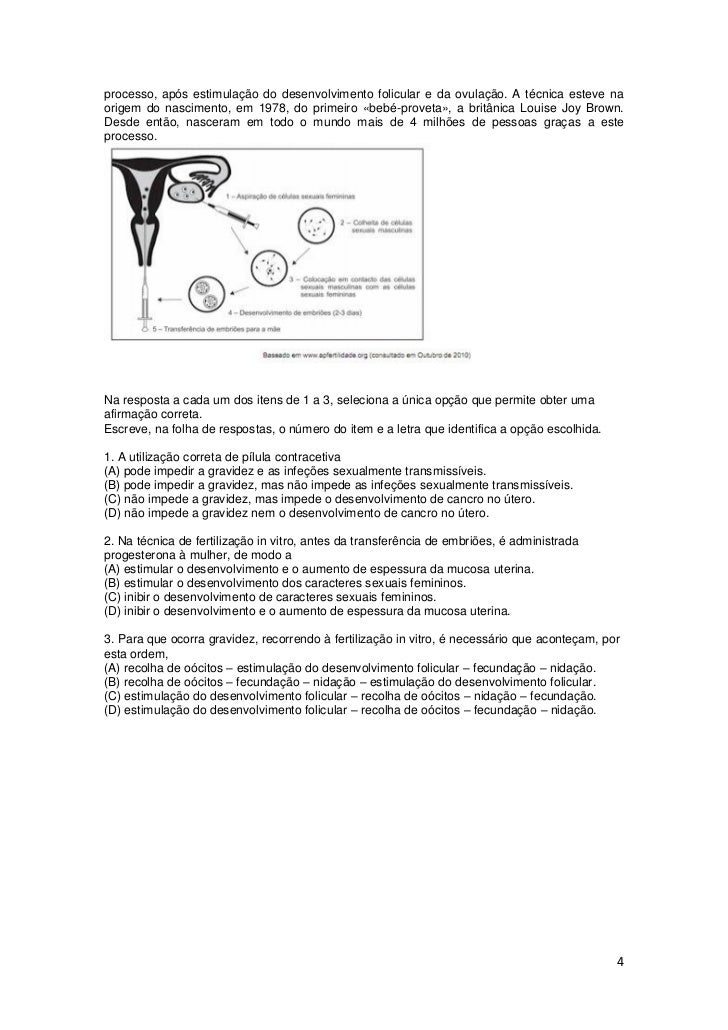 4. 4. processo, após estimulação do desenvolvimento folicular e da ovulação. A técnica esteve naorigem do nascimento, em 1978, do primeiro «bebé-proveta», a britânica Louise Joy Brown.Desde então, nasceram em todo o mundo mais de 4 milhões de pessoas graças a esteprocesso.Na resposta a cada um dos itens de 1 a 3, seleciona a única opção que permite obter umaafirmação correta.Escreve, na folha de respostas, o número do item e a letra que identifica a opção escolhida.1. A utilização correta de pílula contracetiva(A) pode impedir a gravidez e as infeções sexualmente transmissíveis.(B) pode impedir a gravidez, mas não impede as infeções sexualmente transmissíveis.(C) não impede a gravidez, mas impede o desenvolvimento de cancro no útero.(D) não impede a gravidez nem o desenvolvimento de cancro no útero.2. Na técnica de fertilização in vitro, antes da transferência de embriões, é administradaprogesterona à mulher, de modo a(A) estimular o desenvolvimento e o aumento de espessura da mucosa uterina.(B) estimular o desenvolvimento dos caracteres sexuais femininos.(C) inibir o desenvolvimento de caracteres sexuais femininos.(D) inibir o desenvolvimento e o aumento de espessura da mucosa uterina.3. Para que ocorra gravidez, recorrendo à fertilização in vitro, é necessário que aconteçam, poresta ordem,(A) recolha de oócitos – estimulação do desenvolvimento folicular – fecundação – nidação.(B) recolha de oócitos – fecundação – nidação – estimulação do desenvolvimento folicular.(C) estimulação do desenvolvimento folicular – recolha de oócitos – nidação – fecundação.(D) estimulação do desenvolvimento folicular – recolha de oócitos – fecundação – nidação. 4