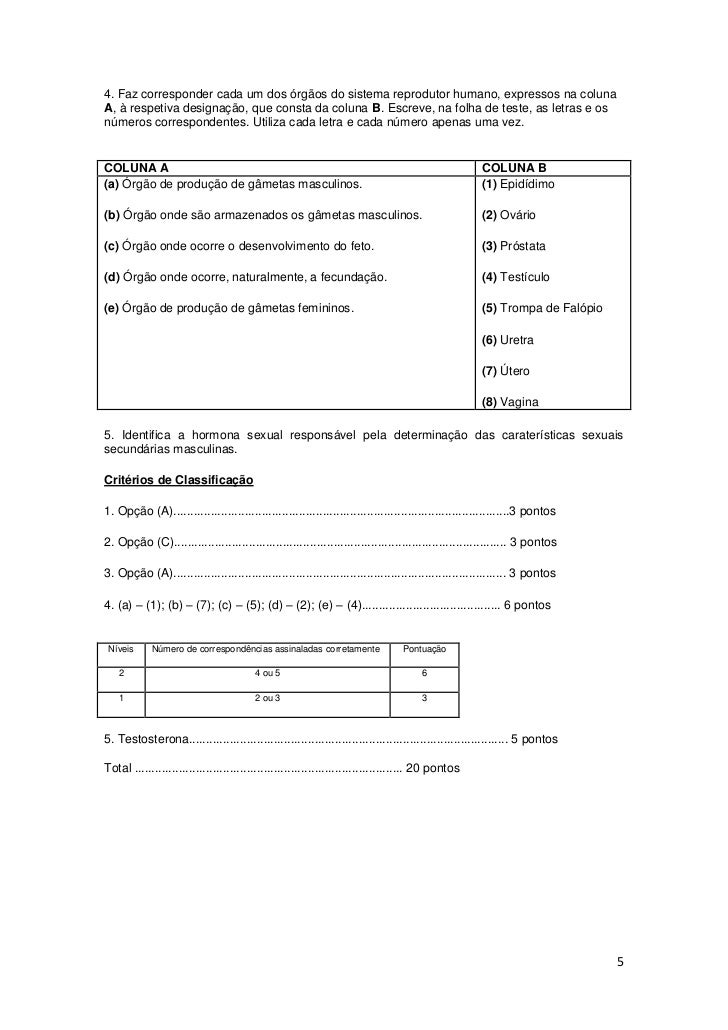 5. 5. 4. Faz corresponder cada um dos órgãos do sistema reprodutor humano, expressos na colunaA, à respetiva designação, que consta da coluna B. Escreve, na folha de teste, as letras e osnúmeros correspondentes. Utiliza cada letra e cada número apenas uma vez.COLUNA A COLUNA B(a) Órgão de produção de gâmetas masculinos. (1) Epidídimo(b) Órgão onde são armazenados os gâmetas masculinos. (2) Ovário(c) Órgão onde ocorre o desenvolvimento do feto. (3) Próstata(d) Órgão onde ocorre, naturalmente, a fecundação. (4) Testículo(e) Órgão de produção de gâmetas femininos. (5) Trompa de Falópio (6) Uretra (7) Útero (8) Vagina5. Identifica a hormona sexual responsável pela determinação das caraterísticas sexuaissecundárias masculinas.Critérios de Classificação1. Opção (A)...................................................................................................3 pontos2. Opção (C).................................................................................................. 3 pontos3. Opção (A).................................................................................................. 3 pontos4. (a) – (1); (b) – (7); (c) – (5); (d) – (2); (e) – (4)......................................... 6 pontos Níveis Número de correspondências assinaladas corretamente Pontuação 2 4 ou 5 6 1 2 ou 3 35. Testosterona.............................................................................................. 5 pontosTotal ............................................................................... 20 pontos 5