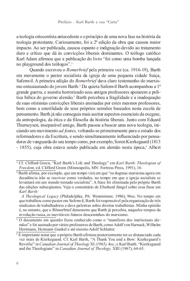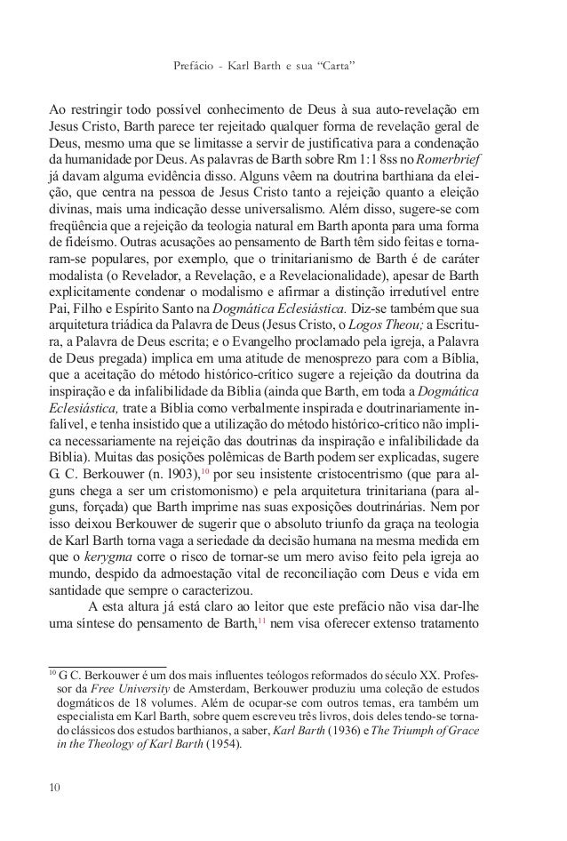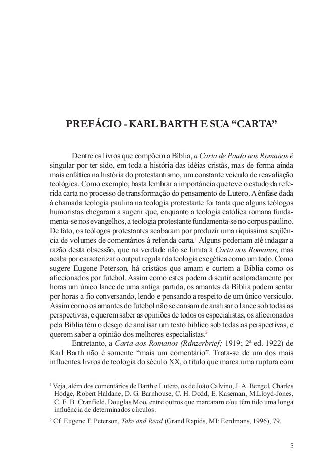 8. 8. 5 PREFÁCIO - KARL BARTH E SUA “CARTA” Dentre os livros que compõem a Bíblia, a Carta de Paulo aos Romanos é singular por ter sido, em toda a história das idéias cristãs, mas de forma ainda mais enfática na história do protestantismo, um constante veículo de reavaliação teológica. Como exemplo, basta lembrar a importância que teve o estudo da refe- rida carta no processo de transformação do pensamento de Lutero.Aênfase dada à chamada teologia paulina na teologia protestante foi tanta que alguns teólogos humoristas chegaram a sugerir que, enquanto a teologia católica romana funda- menta-se nos evangelhos, a teologia protestante fundamenta-se no corpus paulino. De fato, os teólogos protestantes acabaram por produzir uma riquíssima seqüên- cia de volumes de comentários à referida carta.1 Alguns poderiam até indagar a razão desta obsessão, que na verdade não se limita à Carta aos Romanos, mas acaba por caracterizar o output regular da teologia exegética como um todo. Como sugere Eugene Peterson, há cristãos que amam e curtem a Bíblia como os aficcionados por futebol. Assim como estes podem discutir acaloradamente por horas um único lance de uma antiga partida, os amantes da Bíblia podem sentar por horas a fio conversando, lendo e pensando a respeito de um único versículo. Assim como os amantes do futebol não se cansam de analisar o lance sob todas as perspectivas, e querem saber as opiniões de todos os especialistas, os aficcionados pela Bíblia têm o desejo de analisar um texto bíblico sob todas as perspectivas, e querem saber a opinião dos melhores especialistas.2 Entretanto, a Carta aos Romanos (Rdnzerbrief; 1919; 2ª ed. 1922) de Karl Barth não é somente “mais um comentário”. Trata-se de um dos mais influentes livros de teologia do século XX, o título que marca uma ruptura com 1 Veja, além dos comentários de Barth e Lutero, os de João Calvino, J.A. Bengel, Charles Hodge, Robert Haldane, D. G. Barnhouse, C. H. Dodd, E. Kaseman, M.Lloyd-Jones, C. E. B. Cranfield, Douglas Moo, entre outros que marcaram e/ou têm tido uma longa influência de determinados círculos. 2 Cf. Eugene F. Peterson, Take and Read (Grand Rapids, MI: Eerdmans, 1996), 79.