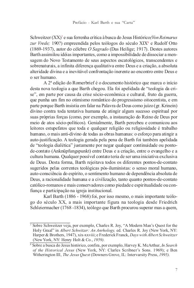 10. 10. 7 Schweitzer (XX)7 e sua ferrenha crítica à busca do Jesus Histórico(Von Reimarus zur Vrede; 190?) empreendida pelos teólogos do século XIX8 e Rudolf Otto (1869-1937), autor do célebre O Sagrado (Das Heilige; 1917). Destes autores Barth assimilou idéias importantes, como a impossibilidade de dissociar a men- sagem do Novo Testamento de seus aspectos escatológicos, transcendentes e sobrenaturais, a infinita diferença qualitativa entre Deus e a criação, a absoluta alteridade divina e a inevitável confrontação inerente ao encontro entre Deus e o ser humano. A 2ª edição do Romerbrief é o documento histórico que marca o início desta nova teologia a que Barth chegou. Ela foi apelidada de “teologia da cri- se”, em parte por causa da crise sócio-econômica e cultural, fruto da guerra, que punha um fim no otimismo romântico do progressismo oitocentista, e em parte porque Barth insistia em falar na Palavra de Deus como juízo (gr. Krinein) divino contra toda tentativa humana de atingir algum sucesso espiritual por suas próprias forças (como, por exemplo, a instauração do Reino de Deus por meio de atos sócio-políticos). Genialmente, Barth percebeu e comunicou aos leitores estupefatos que toda e qualquer religião ou religiosidade é trabalho humano, o mais anti-divino de todas as obras humanas: o esforço para atingir a auto-justificação. A teologia gerada pela pena de Barth foi também apelidada de “teologia dialética” justamente por negar qualquer continuidade ou ponto- de-contato (Anknüpfungspunkt) entre Deus e a criação, entre o evangelho e a cultura humana. Qualquer possível contato teria de ser uma iniciativa exclusiva de Deus. Desta forma, Barth rejeitava todos os diferentes pontos-de-contato sugeridos pelas correntes teológicas pós-iluministas: o senso moral humano, auto-consciência do espírito, o sentimento humano de dependência absoluta de Deus, a racionalidade humana e a civilização, tanto quanto pontos-de-contato católico-romanos e mais conservadores como piedade e espiritualidade ou con- fiança e participação na igreja institucional. Karl Barth (1886 - 1968) foi, por isso mesmo, o mais importante teólo- go do século XX, a mais importante figura na teologia desde Friedrich Schleiermacher (1768 -1834), teólogo que Barth procurou superar mas a quem, 7 Sobre Schweitzer veja, por exemplo, Charles R. Joy, “A Modern Man’s Quest for the HoIy Graal” in Albert Schwitzer: An Anrhology, ed. Charles R. Joy (New York, NY: Harper & Brothers, 1947), xix-xxviii; e Frederick Franck, Days with Albert Schweitzer (New York, NY: Henry Holt & Co., 1959). 8 Sobre a busca do Jesus histórico, confira, por exemplo, Harvey K. McArthur, In Search of the Historical Jesus (New York, NY: Clarles Scribner’s Sons. 1969); e Ben Witherington III, The Jesus Quest (Downers Grove, IL: Intervarsity Press, 1995). Prefácio - Karl Barth e sua “Carta”