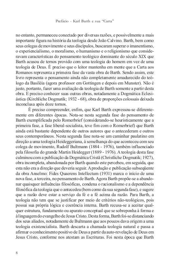 11. 11. 8 no entanto, permaneceu conectado por diversas razões, e possivelmente a mais importante figura na história da teologia desde João Calvino. Barth, bem como seus colegas de movimento e seus discípulos, buscaram superar o imanentismo, o experiencialismo, o moralismo, o humanismo e o religionismo que conside- ravam características do pensamento teológico dominante do século XIX que Barth acusou de ternos provido com uma teologia do homem em vez de uma teologia de Deus. É preciso que o leitor mantenha em mente que a Carta aos Romanos representa a primeira fase da vasta obra de Barth. Sendo assim, este livro representa o pensamento ainda não completamente amadurecido do teó- logo da Basiléia (agora professor em Gottingen e depois em Munster). Não é justo, portanto, fazer uma avaliação da teologia de Barth somente a partir desta obra. E preciso conhecer suas outras obras, notadamente a Dogmática Eclesi- ástica (Kirchliche Dogmatik; 1932 - 68), obra de proporções colossais deixada inconclusa após doze tornos. É preciso compreender, enfim, que Karl Barth expressou-se diferente- mente em diferentes épocas. Nota-se nesta segunda fase do pensamento de Barth exemplificada pelo Romerbrief (considerando-se heuristicamente que a primeira fase, a fase liberal-socialista, teve fim com o Romerbrief) que Barth ainda está bastante dependente de outros autores que o antecederam e outros seus contemporâneos. Nesta segunda fase nota-se um caminhar paulatino em direção a uma teologia Heideggeriana, à semelhança do que aconteceu com seu colega de movimento, Rudolf Bultmann (1884 - 1976), também influenciado pela filosofia do grande Martin Heidegger (1889 - 1976). A teologia desta fase culminou com a publicação da Dogmática Cristã (Christliche Dogmatik; 1927), obra incompleta, abandonada por Barth quando este percebeu, em seguida, que esta não era a direção que deveria seguir.A produção e publicação subseqüente da obra Anselmo: Fides Quaerens Intellectum (1931) marca o início de uma nova fase, a terceira, no pensamento de Barth.Agora Barth propõe-se a abando- nar quaisquer influências filosóficas, condena o racionalismo e a dependência filosófica da teologia que o antecedeu (bem como da sua segunda fase), e sugere que a razão deve estar a serviço da fé e a fé acima da razão. Para Barth, a teologia não tem que se justificar por meio de critérios não-teológicos, pois possui sua própria lógica e coerência interna. Barth recusa-se a aceitar qual- quer estrutura, fundamento ou aparato conceptual que se sobreponha à forma e à linguagem do evangelho de Jesus Cristo. Desta forma, Barth foi-se distanciando dos seus aliados, notadamente de Bultmann que aos poucos dava origem a uma teologia existencialista. Barth descarta a chamada teologia natural e passa a afirmar o conhecimento positivo de Deus a partir da auto-revelação de Deus em Jesus Cristo, conforme nos atestam as Escrituras. Foi nesta época que Barth Prefácio - Karl Barth e sua “Carta”