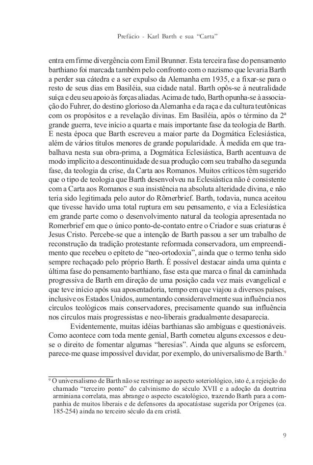 12. 12. 9 entra em firme divergência com Emil Brunner. Esta terceira fase do pensamento barthiano foi marcada também pelo confronto com o nazismo que levaria Barth a perder sua cátedra e a ser expulso da Alemanha em 1935, e a fixar-se para o resto de seus dias em Basiléia, sua cidade natal. Barth opôs-se à neutralidade suíça e deu seu apoio às forças aliadas.Acima de tudo, Barth opunha-se à associa- ção do Fuhrer, do destino glorioso daAlemanha e da raça e da cultura teutônicas com os propósitos e a revelação divinas. Em Basiléia, após o término da 2ª grande guerra, teve início a quarta e mais importante fase da teologia de Barth. E nesta época que Barth escreveu a maior parte da Dogmática Eclesiástica, além de vários títulos menores de grande popularidade. À medida em que tra- balhava nesta sua obra-prima, a Dogmática Eclesiástica, Barth acentuava de modo implícito a descontinuidade de sua produção com seu trabalho da segunda fase, da teologia da crise, da Carta aos Romanos. Muitos críticos têm sugerido que o tipo de teologia que Barth desenvolveu na Eclesiástica não é consistente com a Carta aos Romanos e sua insistência na absoluta alteridade divina, e não teria sido legitimada pelo autor do Rõmerbrief. Barth, todavia, nunca aceitou que tivesse havido uma total ruptura em seu pensamento, e via a Eclesiástica em grande parte como o desenvolvimento natural da teologia apresentada no Romerbrief em que o único ponto-de-contato entre o Criador e suas criaturas é Jesus Cristo. Percebe-se que a intenção de Barth passou a ser um trabalho de reconstrução da tradição protestante reformada conservadora, um empreendi- mento que recebeu o epíteto de “neo-ortodoxia”, ainda que o termo tenha sido sempre rechaçado pelo próprio Barth. É possível destacar ainda uma quinta e última fase do pensamento barthiano, fase esta que marca o final da caminhada progressiva de Barth em direção de uma posição cada vez mais evangelical e que teve início após sua aposentadoria, tempo em que viajou a diversos países, inclusive os Estados Unidos, aumentando consideravelmente sua influência nos círculos teológicos mais conservadores, precisamente quando sua influência nos círculos mais progressistas e neo-liberais gradualmente desaparecia. Evidentemente, muitas idéias barthianas são ambíguas e questionáveis. Como acontece com toda mente genial, Barth cometeu alguns excessos e deu- se o direito de fomentar algumas “heresias”. Ainda que alguns se esforcem, parece-me quase impossível duvidar, por exemplo, do universalismo de Barth.9 9 O universalismo de Barth não se restringe ao aspecto soteriológico, isto é, a rejeição do chamado “terceiro ponto” do calvinismo do século XVII e a adoção da doutrina arminiana correlata, mas abrange o aspecto escatológico, trazendo Barth para a com- panhia de muitos liberais e de defensores da apocatástase sugerida por Orígenes (ca. 185-254) ainda no terceiro século da era cristã. Prefácio - Karl Barth e sua “Carta”