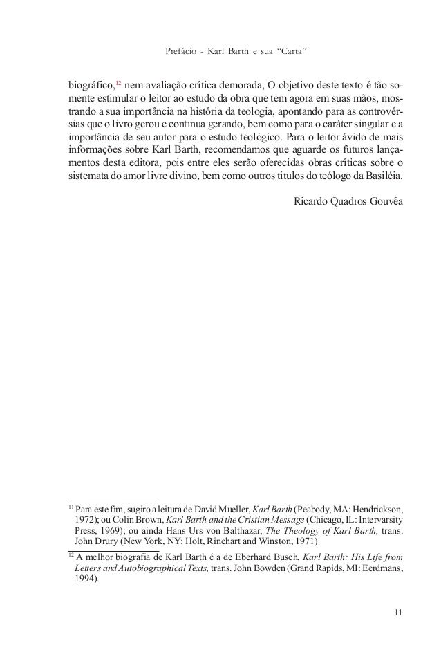 14. 14. 11 biográfico,12 nem avaliação crítica demorada, O objetivo deste texto é tão so- mente estimular o leitor ao estudo da obra que tem agora em suas mãos, mos- trando a sua importância na história da teologia, apontando para as controvér- sias que o livro gerou e continua gerando, bem como para o caráter singular e a importância de seu autor para o estudo teológico. Para o leitor ávido de mais informações sobre Karl Barth, recomendamos que aguarde os futuros lança- mentos desta editora, pois entre eles serão oferecidas obras críticas sobre o sistemata do amor livre divino, bem como outros títulos do teólogo da Basiléia. Ricardo Quadros Gouvêa 11 Para este fim, sugiro a leitura de David Mueller, Karl Barth (Peabody, MA: Hendrickson, 1972); ou Colin Brown, Karl Barth and the Cristian Message (Chicago, IL: Intervarsity Press, 1969); ou ainda Hans Urs von Balthazar, The Theology of Karl Barth, trans. John Drury (New York, NY: Holt, Rinehart and Winston, 1971) 12 A melhor biografia de Karl Barth é a de Eberhard Busch, Karl Barth: His Life from Letters andAutobiographical Texts, trans. John Bowden (Grand Rapids, MI: Eerdmans, 1994). Prefácio - Karl Barth e sua “Carta”