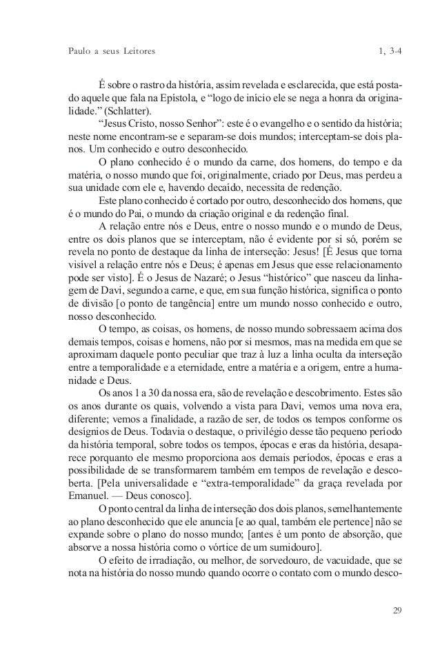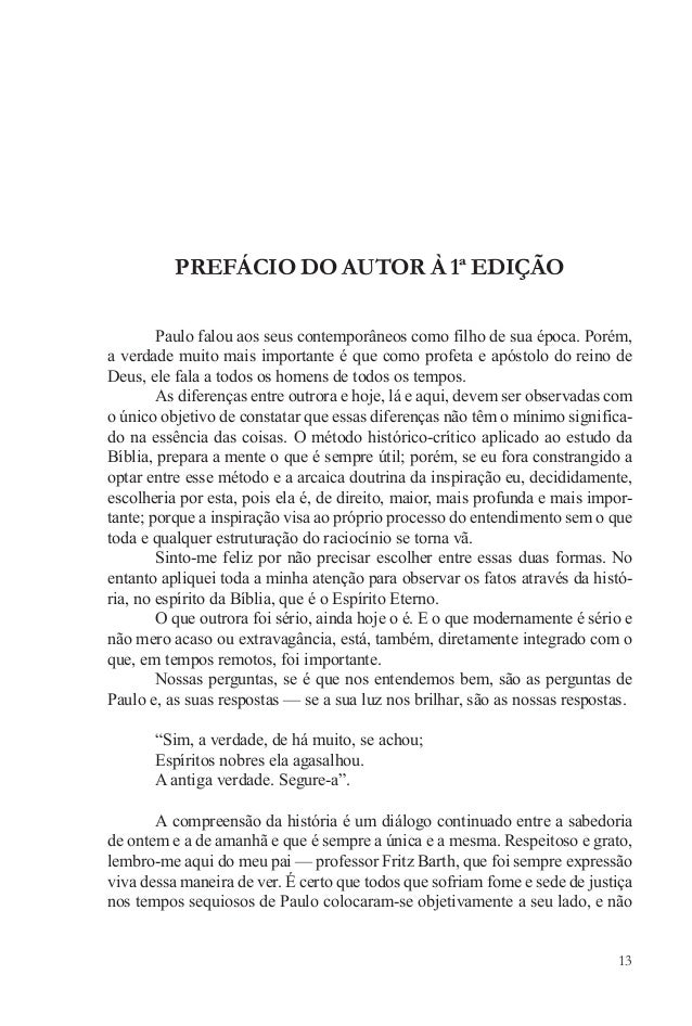 15. 15. 13 PREFÁCIO DO AUTOR À 1ª EDIÇÃO Paulo falou aos seus contemporâneos como filho de sua época. Porém, a verdade muito mais importante é que como profeta e apóstolo do reino de Deus, ele fala a todos os homens de todos os tempos. As diferenças entre outrora e hoje, lá e aqui, devem ser observadas com o único objetivo de constatar que essas diferenças não têm o mínimo significa- do na essência das coisas. O método histórico-crítico aplicado ao estudo da Bíblia, prepara a mente o que é sempre útil; porém, se eu fora constrangido a optar entre esse método e a arcaica doutrina da inspiração eu, decididamente, escolheria por esta, pois ela é, de direito, maior, mais profunda e mais impor- tante; porque a inspiração visa ao próprio processo do entendimento sem o que toda e qualquer estruturação do raciocínio se torna vã. Sinto-me feliz por não precisar escolher entre essas duas formas. No entanto apliquei toda a minha atenção para observar os fatos através da histó- ria, no espírito da Bíblia, que é o Espírito Eterno. O que outrora foi sério, ainda hoje o é. E o que modernamente é sério e não mero acaso ou extravagância, está, também, diretamente integrado com o que, em tempos remotos, foi importante. Nossas perguntas, se é que nos entendemos bem, são as perguntas de Paulo e, as suas respostas — se a sua luz nos brilhar, são as nossas respostas. “Sim, a verdade, de há muito, se achou; Espíritos nobres ela agasalhou. A antiga verdade. Segure-a”. A compreensão da história é um diálogo continuado entre a sabedoria de ontem e a de amanhã e que é sempre a única e a mesma. Respeitoso e grato, lembro-me aqui do meu pai — professor Fritz Barth, que foi sempre expressão viva dessa maneira de ver. É certo que todos que sofriam fome e sede de justiça nos tempos sequiosos de Paulo colocaram-se objetivamente a seu lado, e não