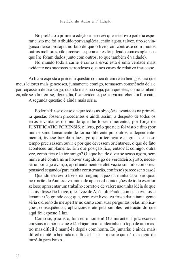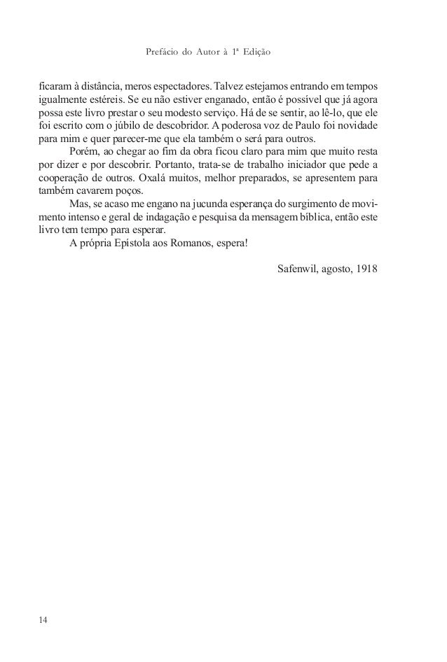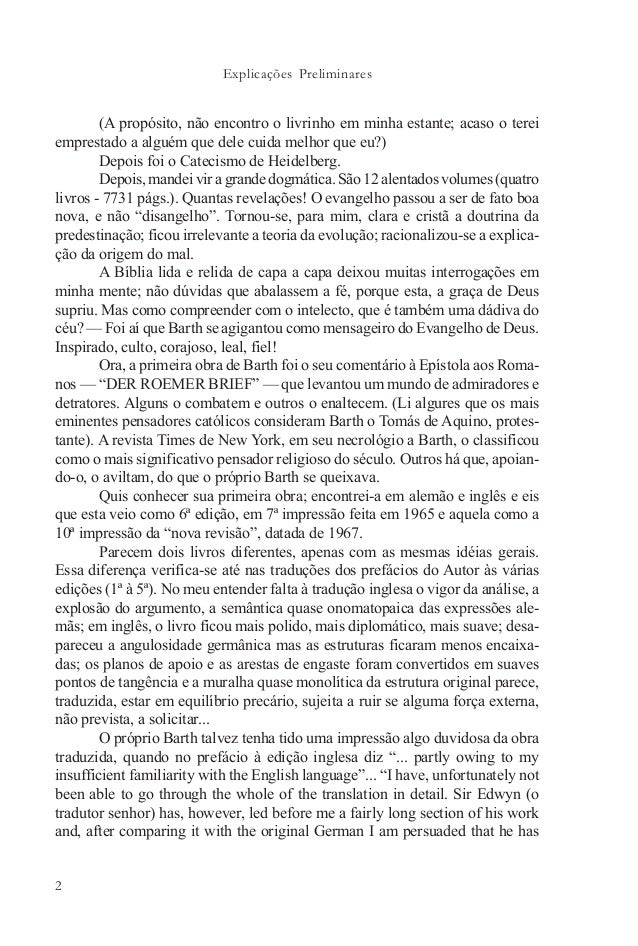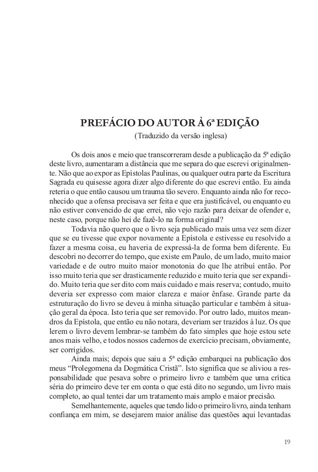21. 21. 19 PREFÁCIO DO AUTOR À 6ª EDIÇÃO (Traduzido da versão inglesa) Os dois anos e meio que transcorreram desde a publicação da 5ª edição deste livro, aumentaram a distância que me separa do que escrevi originalmen- te. Não que ao expor as Epístolas Paulinas, ou qualquer outra parte da Escritura Sagrada eu quisesse agora dizer algo diferente do que escrevi então. Eu ainda reteria o que então causou um trauma tão severo. Enquanto ainda não for reco- nhecido que a ofensa precisava ser feita e que era justificável, ou enquanto eu não estiver convencido de que errei, não vejo razão para deixar de ofender e, neste caso, porque não hei de fazê-lo na forma original? Todavia não quero que o livro seja publicado mais uma vez sem dizer que se eu tivesse que expor novamente a Epístola e estivesse eu resolvido a fazer a mesma coisa, eu haveria de expressá-la de forma bem diferente. Eu descobri no decorrer do tempo, que existe em Paulo, de um lado, muito maior variedade e de outro muito maior monotonia do que lhe atribuí então. Por isso muito teria que ser drasticamente reduzido e muito teria que ser expandi- do. Muito teria que ser dito com mais cuidado e mais reserva; contudo, muito deveria ser expresso com maior clareza e maior ênfase. Grande parte da estruturação do livro se deveu à minha situação particular e também à situa- ção geral da época. Isto teria que ser removido. Por outro lado, muitos mean- dros da Epístola, que então eu não notara, deveriam ser trazidos à luz. Os que lerem o livro devem lembrar-se também do fato simples que hoje estou sete anos mais velho, e todos nossos cadernos de exercício precisam, obviamente, ser corrigidos. Ainda mais; depois que saiu a 5ª edição embarquei na publicação dos meus “Prolegomena da Dogmática Cristã”. Isto significa que se aliviou a res- ponsabilidade que pesava sobre o primeiro livro e também que uma crítica séria do primeiro deve ter em conta o que está dito no segundo, um livro mais completo, ao qual tentei dar um tratamento mais amplo e maior precisão. Semelhantemente, aqueles que tendo lido o primeiro livro, ainda tenham confiança em mim, se desejarem maior análise das questões aqui levantadas