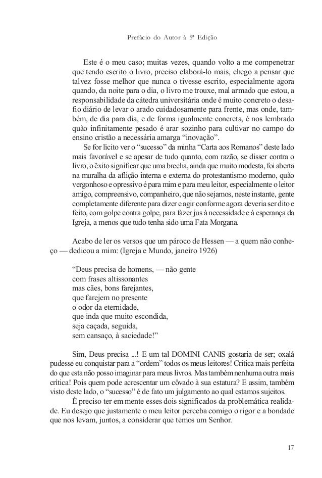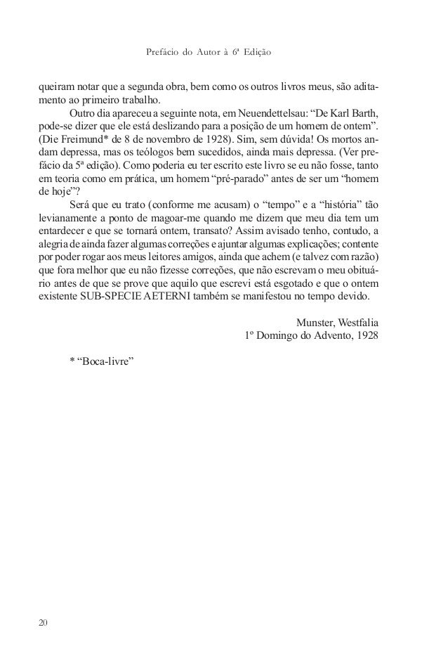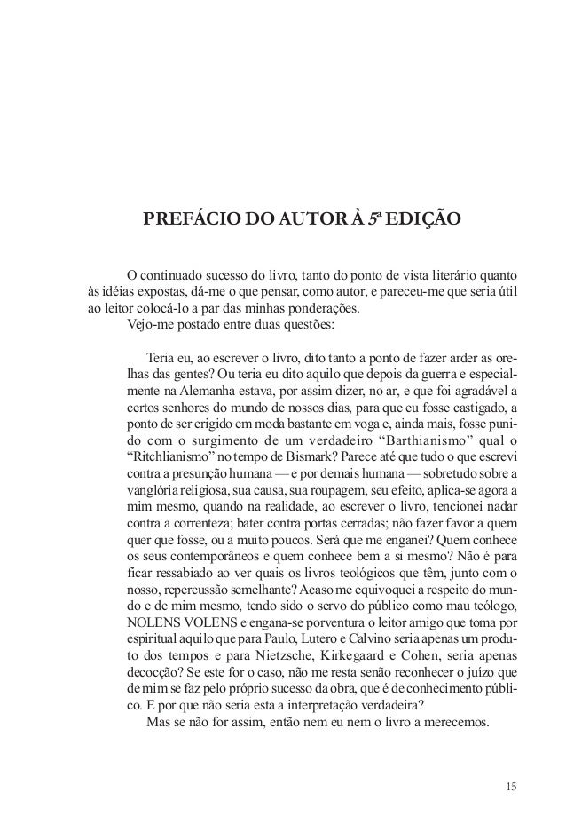 17. 17. 15 PREFÁCIO DO AUTOR À 5ª EDIÇÃO O continuado sucesso do livro, tanto do ponto de vista literário quanto às idéias expostas, dá-me o que pensar, como autor, e pareceu-me que seria útil ao leitor colocá-lo a par das minhas ponderações. Vejo-me postado entre duas questões: Teria eu, ao escrever o livro, dito tanto a ponto de fazer arder as ore- lhas das gentes? Ou teria eu dito aquilo que depois da guerra e especial- mente na Alemanha estava, por assim dizer, no ar, e que foi agradável a certos senhores do mundo de nossos dias, para que eu fosse castigado, a ponto de ser erigido em moda bastante em voga e, ainda mais, fosse puni- do com o surgimento de um verdadeiro “Barthianismo” qual o “Ritchlianismo” no tempo de Bismark? Parece até que tudo o que escrevi contra a presunção humana — e por demais humana — sobretudo sobre a vanglória religiosa, sua causa, sua roupagem, seu efeito, aplica-se agora a mim mesmo, quando na realidade, ao escrever o livro, tencionei nadar contra a correnteza; bater contra portas cerradas; não fazer favor a quem quer que fosse, ou a muito poucos. Será que me enganei? Quem conhece os seus contemporâneos e quem conhece bem a si mesmo? Não é para ficar ressabiado ao ver quais os livros teológicos que têm, junto com o nosso, repercussão semelhante? Acaso me equivoquei a respeito do mun- do e de mim mesmo, tendo sido o servo do público como mau teólogo, NOLENS VOLENS e engana-se porventura o leitor amigo que toma por espiritual aquilo que para Paulo, Lutero e Calvino seria apenas um produ- to dos tempos e para Nietzsche, Kirkegaard e Cohen, seria apenas decocção? Se este for o caso, não me resta senão reconhecer o juízo que de mim se faz pelo próprio sucesso da obra, que é de conhecimento públi- co. E por que não seria esta a interpretação verdadeira? Mas se não for assim, então nem eu nem o livro a merecemos.