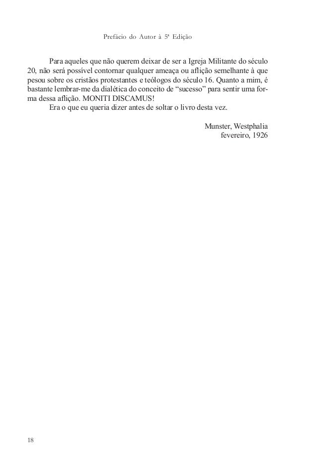 20. 20. 18 Para aqueles que não querem deixar de ser a Igreja Militante do século 20, não será possível contornar qualquer ameaça ou aflição semelhante à que pesou sobre os cristãos protestantes e teólogos do século 16. Quanto a mim, é bastante lembrar-me da dialética do conceito de “sucesso” para sentir uma for- ma dessa aflição. MONITI DISCAMUS! Era o que eu queria dizer antes de soltar o livro desta vez. Munster, Westphalia fevereiro, 1926 Prefácio do Autor à 5ª Edição