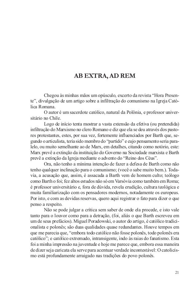 23. 23. 21 AB EXTRA, AD REM Chegou às minhas mãos um opúsculo, excerto da revista “Hora Presen- te”, divulgação de um artigo sobre a infiltração do comunismo na Igreja Cató- lica Romana. O autor é um sacerdote católico, natural da Polônia, e professor univer- sitário no Chile. Logo de início tenta mostrar a vasta extensão da efetiva (ou pretendida) infiltração do Marxismo no clero Romano e diz que ela se deu através dos pasto- res protestantes, estes, por sua vez, fortemente influenciados por Barth que, se- gundo o articulista, teria sido membro do “partido” e cujo pensamento seria para- lelo, ou muito semelhante ao de Marx, em detalhes, citando como notório, este: Marx prevê a extinção da instituição do Governo na Sociedade marxista e Barth prevê a extinção da Igreja mediante o advento do “Reino dos Céus”. Ora, não tenho a mínima intenção de fazer a defesa de Barth como não tenho qualquer inclinação para o comunismo; (você o sabe muito bem.). Toda- via, a acusação que, assim, é assacada a Barth vem de homem culto; teólogo como Barth o foi; fez altos estudos não só em Varsóvia como também em Roma; é professor universitário e, fora de dúvida, revela erudição, cultura teológica e muita familiarização com os pensadores modernos, notadamente os europeus. Por isto, e com as devidas reservas, quero aqui registrar o fato para dizer o que penso a respeito. Não se pode julgar a crítica sem saber de onde ela procede, e isto vale tanto para o louvor como para a detração, (foi, aliás o que Barth escreveu em um de seus prefácios). Miguel Poradowski, o autor do artigo, é católico tradici- onalista e polonês; são duas qualidades quase redundantes. Houve tempos em que me parecia que, “embora todo católico não fosse polonês, todo polonês era católico”; e católico extremado, intransigente, indo às raias do fanatismo. Esta foi a minha impressão na juventude e hoje me parece que, embora essa maneira de dizer seja caricata ela serve para acentuar verdade incontestável: O catolicis- mo está profundamente arraigado nas tradições do povo polonês.
