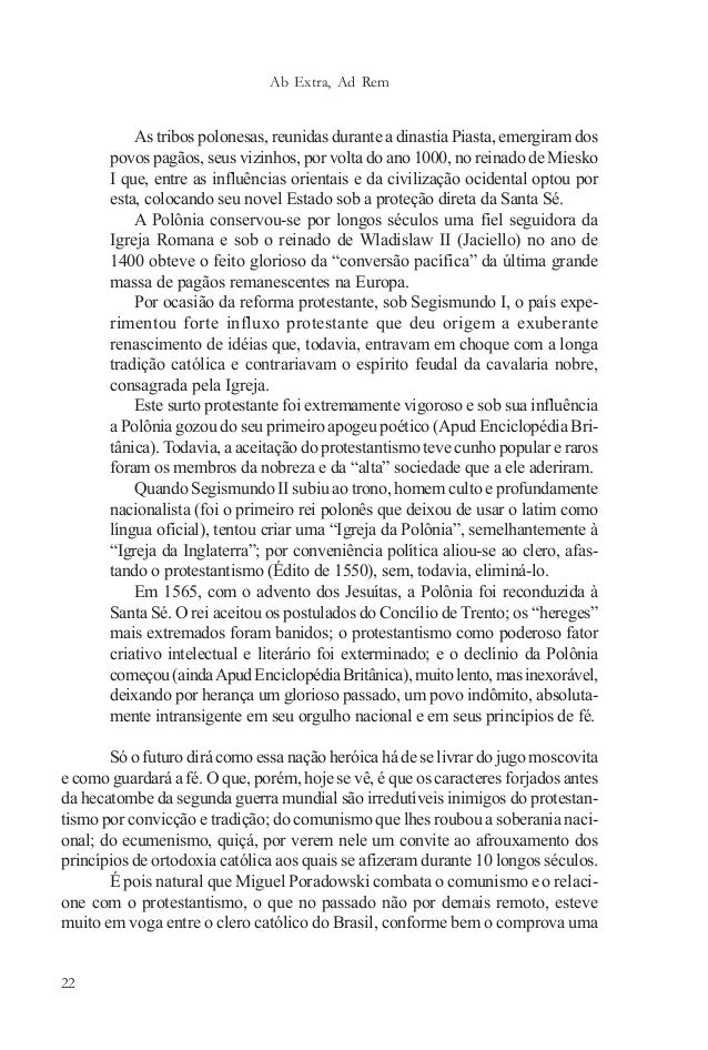 24. 24. 22 As tribos polonesas, reunidas durante a dinastia Piasta, emergiram dos povos pagãos, seus vizinhos, por volta do ano 1000, no reinado de Miesko I que, entre as influências orientais e da civilização ocidental optou por esta, colocando seu novel Estado sob a proteção direta da Santa Sé. A Polônia conservou-se por longos séculos uma fiel seguidora da Igreja Romana e sob o reinado de Wladislaw II (Jaciello) no ano de 1400 obteve o feito glorioso da “conversão pacífica” da última grande massa de pagãos remanescentes na Europa. Por ocasião da reforma protestante, sob Segismundo I, o país expe- rimentou forte influxo protestante que deu origem a exuberante renascimento de idéias que, todavia, entravam em choque com a longa tradição católica e contrariavam o espírito feudal da cavalaria nobre, consagrada pela Igreja. Este surto protestante foi extremamente vigoroso e sob sua influência a Polônia gozou do seu primeiro apogeu poético (Apud Enciclopédia Bri- tânica). Todavia, a aceitação do protestantismo teve cunho popular e raros foram os membros da nobreza e da “alta” sociedade que a ele aderiram. Quando Segismundo II subiu ao trono, homem culto e profundamente nacionalista (foi o primeiro rei polonês que deixou de usar o latim como língua oficial), tentou criar uma “Igreja da Polônia”, semelhantemente à “Igreja da Inglaterra”; por conveniência política aliou-se ao clero, afas- tando o protestantismo (Édito de 1550), sem, todavia, eliminá-lo. Em 1565, com o advento dos Jesuítas, a Polônia foi reconduzida à Santa Sé. O rei aceitou os postulados do Concílio de Trento; os “hereges” mais extremados foram banidos; o protestantismo como poderoso fator criativo intelectual e literário foi exterminado; e o declínio da Polônia começou(aindaApudEnciclopédiaBritânica),muitolento,masinexorável, deixando por herança um glorioso passado, um povo indômito, absoluta- mente intransigente em seu orgulho nacional e em seus princípios de fé. Só o futuro dirá como essa nação heróica há de se livrar do jugo moscovita e como guardará a fé. O que, porém, hoje se vê, é que os caracteres forjados antes da hecatombe da segunda guerra mundial são irredutíveis inimigos do protestan- tismo por convicção e tradição; do comunismo que lhes roubou a soberania naci- onal; do ecumenismo, quiçá, por verem nele um convite ao afrouxamento dos princípios de ortodoxia católica aos quais se afizeram durante 10 longos séculos. É pois natural que Miguel Poradowski combata o comunismo e o relaci- one com o protestantismo, o que no passado não por demais remoto, esteve muito em voga entre o clero católico do Brasil, conforme bem o comprova uma Ab Extra, Ad Rem