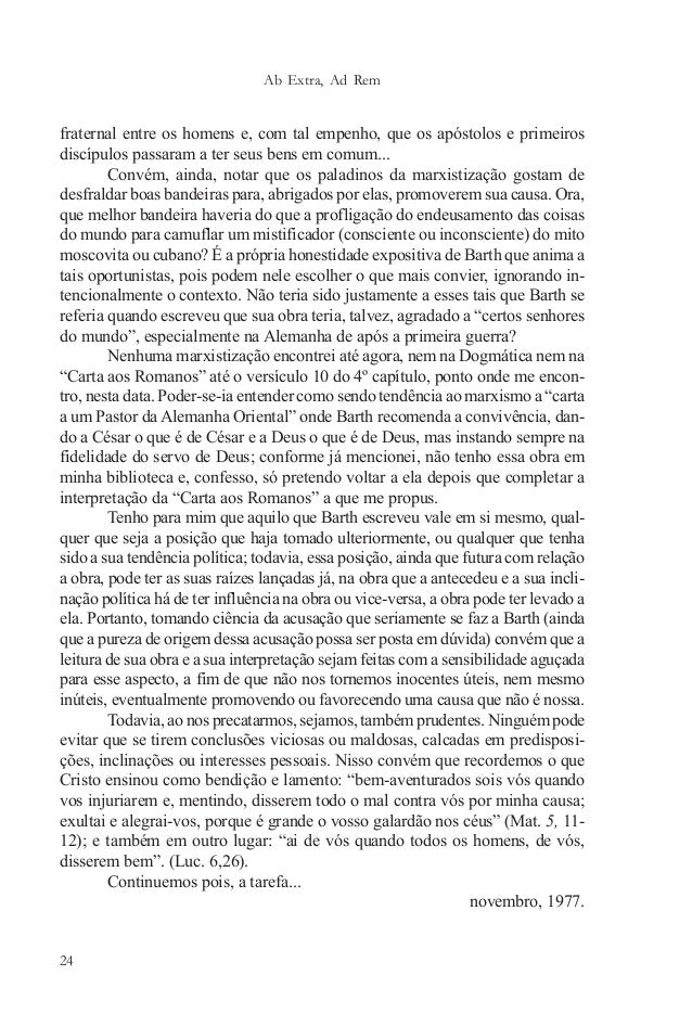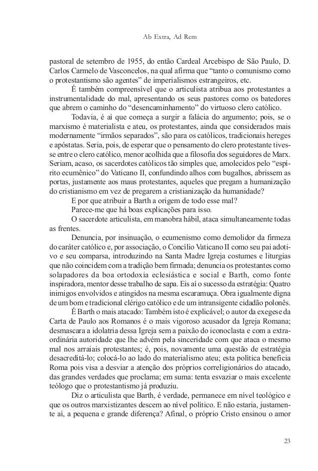 25. 25. 23 pastoral de setembro de 1955, do então Cardeal Arcebispo de São Paulo, D. Carlos Carmelo de Vasconcelos, na qual afirma que “tanto o comunismo como o protestantismo são agentes” de imperialismos estrangeiros, etc. É também compreensível que o articulista atribua aos protestantes a instrumentalidade do mal, apresentando os seus pastores como os batedores que abrem o caminho do “desencaminhamento” do virtuoso clero católico. Todavia, é aí que começa a surgir a falácia do argumento; pois, se o marxismo é materialista e ateu, os protestantes, ainda que considerados mais modernamente “irmãos separados”, são para os católicos, tradicionais hereges e apóstatas. Seria, pois, de esperar que o pensamento do clero protestante tives- se entre o clero católico, menor acolhida que a filosofia dos seguidores de Marx. Seriam, acaso, os sacerdotes católicos tão simples que, amolecidos pelo “espí- rito ecumênico” do Vaticano II, confundindo alhos com bugalhos, abrissem as portas, justamente aos maus protestantes, aqueles que pregam a humanização do cristianismo em vez de pregarem a cristianização da humanidade? E por que atribuir a Barth a origem de todo esse mal? Parece-me que há boas explicações para isso. O sacerdote articulista, em manobra hábil, ataca simultaneamente todas as frentes. Denuncia, por insinuação, o ecumenismo como demolidor da firmeza do caráter católico e, por associação, o Concílio Vaticano II como seu pai adoti- vo e seu comparsa, introduzindo na Santa Madre Igreja costumes e liturgias que não coincidem com a tradição bem firmada; denuncia os protestantes como solapadores da boa ortodoxia eclesiástica e social e Barth, como fonte inspiradora, mentor desse trabalho de sapa. Eis aí o sucesso da estratégia: Quatro inimigos envolvidos e atingidos na mesma escaramuça. Obra igualmente digna de um bom e tradicional clérigo católico e de um intransigente cidadão polonês. É Barth o mais atacado: Também isto é explicável; o autor da exegese da Carta de Paulo aos Romanos é o mais vigoroso acusador da Igreja Romana; desmascara a idolatria dessa Igreja sem a paixão do iconoclasta e com a extra- ordinária autoridade que lhe advém pela sinceridade com que ataca o mesmo mal nos arraiais protestantes; é, pois, novamente uma questão de estratégia desacreditá-lo; colocá-lo ao lado do materialismo ateu; esta política beneficia Roma pois visa a desviar a atenção dos próprios correligionários do atacado, das grandes verdades que proclama; em suma: tenta esvaziar o mais excelente teólogo que o protestantismo já produziu. Diz o articulista que Barth, é verdade, permanece em nível teológico e que os outros marxistizantes descem ao nível político. E não estaria, justamen- te aí, a pequena e grande diferença? Afinal, o próprio Cristo ensinou o amor Ab Extra, Ad Rem