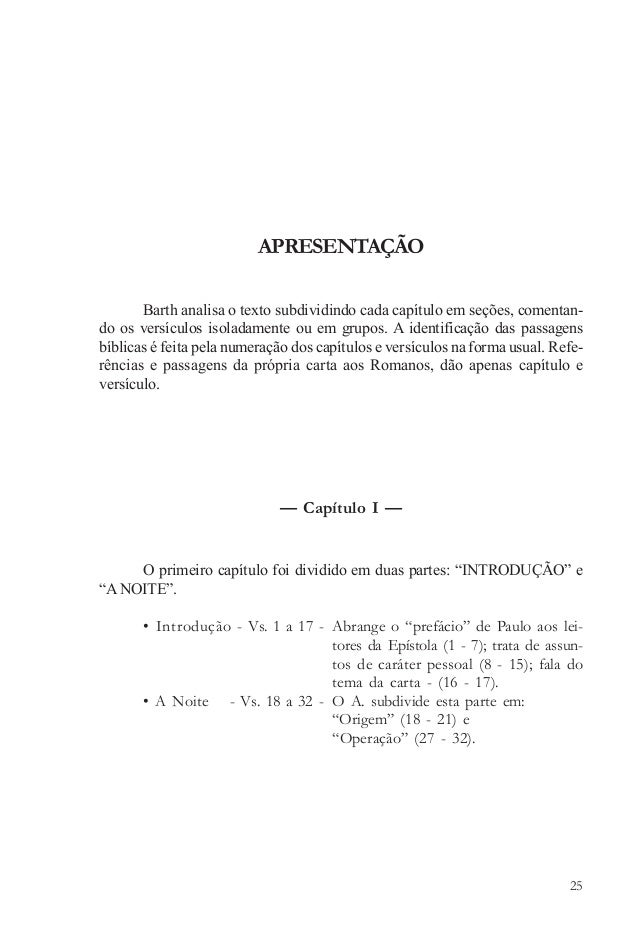 27. 27. 25 APRESENTAÇÃO Barth analisa o texto subdividindo cada capítulo em seções, comentan- do os versículos isoladamente ou em grupos. A identificação das passagens bíblicas é feita pela numeração dos capítulos e versículos na forma usual. Refe- rências e passagens da própria carta aos Romanos, dão apenas capítulo e versículo. — Capítulo I — O primeiro capítulo foi dividido em duas partes: “INTRODUÇÃO” e “A NOITE”. • Introdução - Vs. 1 a 17 - Abrange o “prefácio” de Paulo aos lei- tores da Epístola (1 - 7); trata de assun- tos de caráter pessoal (8 - 15); fala do tema da carta - (16 - 17). • A Noite - Vs. 18 a 32 - O A. subdivide esta parte em: “Origem” (18 - 21) e “Operação” (27 - 32).