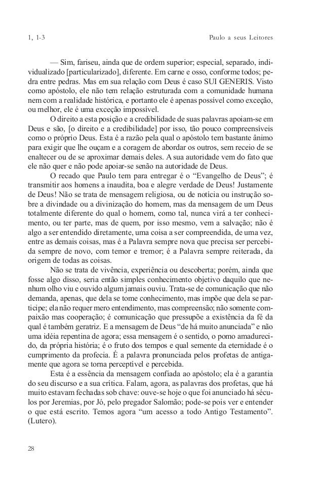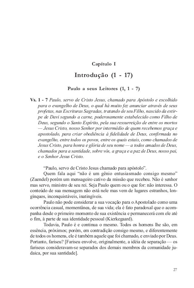 28. 28. 27 Capítulo I Introdução (1 - 17) Paulo a seus Leitores (1, 1 - 7) Vs. 1 - 7 Paulo, servo de Cristo Jesus, chamado para Apóstolo e escolhido para o evangelho de Deus, o qual há muito fez anunciar através de seus profetas, nas Escrituras Sagradas, tratando de seu Filho, nascido da estir- pe de Davi segundo a carne, poderosamente estabelecido como Filho de Deus, segundo o Santo Espírito, pela sua ressurreição de entre os mortos — Jesus Cristo, nosso Senhor por intermédio de quem recebemos graça e apostolado, para criar obediência à fidelidade de Deus, confirmada no evangelho, entre todos os povos, entre os quais estais, como chamados de Jesus Cristo, para honra e glória de seu nome — a todos amados de Deus, chamados para a santidade, sobre vós, a graça e a paz de Deus, nosso pai, e o Senhor Jesus Cristo. “Paulo, servo de Cristo Jesus chamado para apóstolo”. Quem fala aqui “não é um gênio entusiasmado consigo mesmo” (Zuendel) porém um mensageiro cativo da missão que recebeu. Não é senhor mas servo, ministro de seu rei. Seja Paulo quem ou o que for: não interessa. O conteúdo de sua mensagem não está nele mas vem de lugares estranhos, lon- gínquos, inconquistáveis, inatingíveis. Paulo não pode considerar a sua vocação para o Apostolado como uma ocorrência casual, momentânea, de sua vida; ela é fato paradoxal que o acom- panha desde o primeiro momento de sua existência e permanecerá com ele até o fim, à parte de sua identidade pessoal (Kierkegaard). Todavia, Paulo é e continua o mesmo. Todos os homens lhe são, em essência, próximos; porém, em contradição consigo mesmo, e diferentemente de todos os homens, ele é também aquele que foi chamado, e enviado por Deus. Portanto, fariseu? [Fariseu envolve, originalmente, a idéia de separação — os fariseus consideravam-se separados dos demais membros da comunidade ju- daica, por sua santidade].