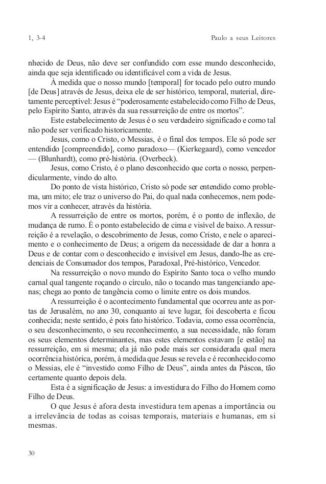 31. 31. 30 nhecido de Deus, não deve ser confundido com esse mundo desconhecido, ainda que seja identificado ou identificável com a vida de Jesus. À medida que o nosso mundo [temporal] for tocado pelo outro mundo [de Deus] através de Jesus, deixa ele de ser histórico, temporal, material, dire- tamente perceptível: Jesus é “poderosamente estabelecido como Filho de Deus, pelo Espírito Santo, através da sua ressurreição de entre os mortos”. Este estabelecimento de Jesus é o seu verdadeiro significado e como tal não pode ser verificado historicamente. Jesus, como o Cristo, o Messias, é o final dos tempos. Ele só pode ser entendido [compreendido], como paradoxo— (Kierkegaard), como vencedor — (Blunhardt), como pré-história. (Overbeck). Jesus, como Cristo, é o plano desconhecido que corta o nosso, perpen- dicularmente, vindo do alto. Do ponto de vista histórico, Cristo só pode ser entendido como proble- ma, um mito; ele traz o universo do Pai, do qual nada conhecemos, nem pode- mos vir a conhecer, através da história. A ressurreição de entre os mortos, porém, é o ponto de inflexão, de mudança de rumo. É o ponto estabelecido de cima e visível de baixo. A ressur- reição é a revelação, o descobrimento de Jesus, como Cristo, e nele o apareci- mento e o conhecimento de Deus; a origem da necessidade de dar a honra a Deus e de contar com o desconhecido e invisível em Jesus, dando-lhe as cre- denciais de Consumador dos tempos, Paradoxal, Pré-histórico, Vencedor. Na ressurreição o novo mundo do Espírito Santo toca o velho mundo carnal qual tangente roçando o círculo, não o tocando mas tangenciando ape- nas; chega ao ponto de tangência como o limite entre os dois mundos. A ressurreição é o acontecimento fundamental que ocorreu ante as por- tas de Jerusalém, no ano 30, conquanto aí teve lugar, foi descoberta e ficou conhecida; neste sentido, é pois fato histórico. Todavia, como essa ocorrência, o seu desconhecimento, o seu reconhecimento, a sua necessidade, não foram os seus elementos determinantes, mas estes elementos estavam [e estão] na ressurreição, em si mesma; ela já não pode mais ser considerada qual mera ocorrência histórica, porém, à medida que Jesus se revela e é reconhecido como o Messias, ele é “investido como Filho de Deus”, ainda antes da Páscoa, tão certamente quanto depois dela. Esta é a significação de Jesus: a investidura do Filho do Homem como Filho de Deus. O que Jesus é afora desta investidura tem apenas a importância ou a irrelevância de todas as coisas temporais, materiais e humanas, em si mesmas. 1, 3-4 Paulo a seus Leitores