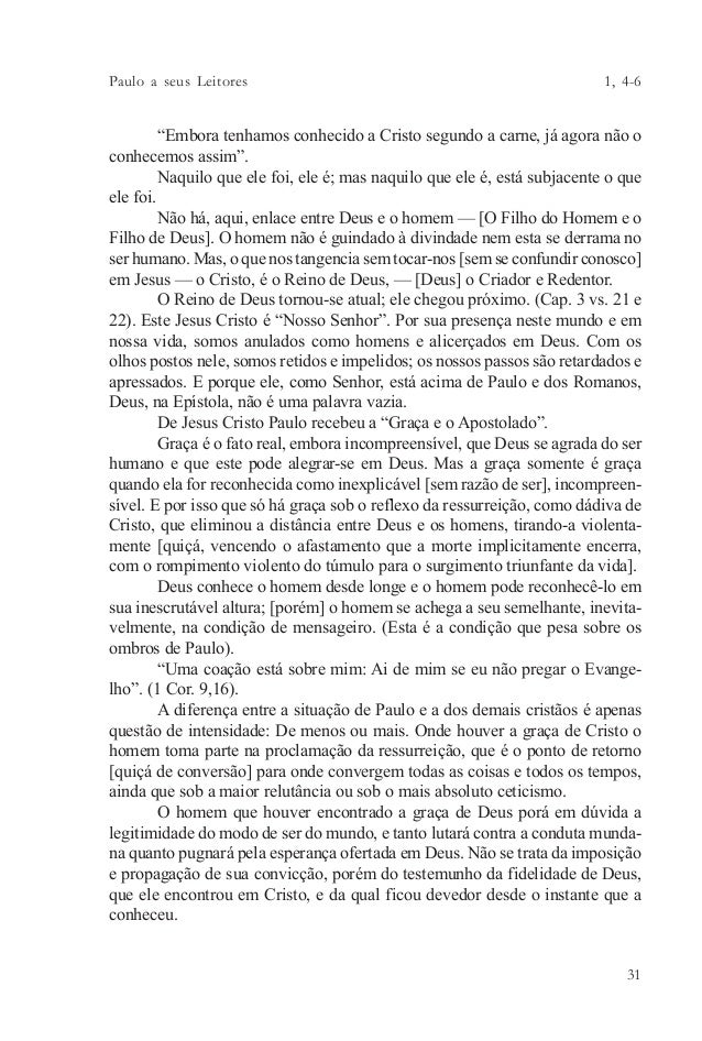 32. 32. 31 “Embora tenhamos conhecido a Cristo segundo a carne, já agora não o conhecemos assim”. Naquilo que ele foi, ele é; mas naquilo que ele é, está subjacente o que ele foi. Não há, aqui, enlace entre Deus e o homem — [O Filho do Homem e o Filho de Deus]. O homem não é guindado à divindade nem esta se derrama no ser humano. Mas, o que nos tangencia sem tocar-nos [sem se confundir conosco] em Jesus — o Cristo, é o Reino de Deus, — [Deus] o Criador e Redentor. O Reino de Deus tornou-se atual; ele chegou próximo. (Cap. 3 vs. 21 e 22). Este Jesus Cristo é “Nosso Senhor”. Por sua presença neste mundo e em nossa vida, somos anulados como homens e alicerçados em Deus. Com os olhos postos nele, somos retidos e impelidos; os nossos passos são retardados e apressados. E porque ele, como Senhor, está acima de Paulo e dos Romanos, Deus, na Epístola, não é uma palavra vazia. De Jesus Cristo Paulo recebeu a “Graça e o Apostolado”. Graça é o fato real, embora incompreensível, que Deus se agrada do ser humano e que este pode alegrar-se em Deus. Mas a graça somente é graça quando ela for reconhecida como inexplicável [sem razão de ser], incompreen- sível. E por isso que só há graça sob o reflexo da ressurreição, como dádiva de Cristo, que eliminou a distância entre Deus e os homens, tirando-a violenta- mente [quiçá, vencendo o afastamento que a morte implicitamente encerra, com o rompimento violento do túmulo para o surgimento triunfante da vida]. Deus conhece o homem desde longe e o homem pode reconhecê-lo em sua inescrutável altura; [porém] o homem se achega a seu semelhante, inevita- velmente, na condição de mensageiro. (Esta é a condição que pesa sobre os ombros de Paulo). “Uma coação está sobre mim: Ai de mim se eu não pregar o Evange- lho”. (1 Cor. 9,16). A diferença entre a situação de Paulo e a dos demais cristãos é apenas questão de intensidade: De menos ou mais. Onde houver a graça de Cristo o homem toma parte na proclamação da ressurreição, que é o ponto de retorno [quiçá de conversão] para onde convergem todas as coisas e todos os tempos, ainda que sob a maior relutância ou sob o mais absoluto ceticismo. O homem que houver encontrado a graça de Deus porá em dúvida a legitimidade do modo de ser do mundo, e tanto lutará contra a conduta munda- na quanto pugnará pela esperança ofertada em Deus. Não se trata da imposição e propagação de sua convicção, porém do testemunho da fidelidade de Deus, que ele encontrou em Cristo, e da qual ficou devedor desde o instante que a conheceu. Paulo a seus Leitores 1, 4-6