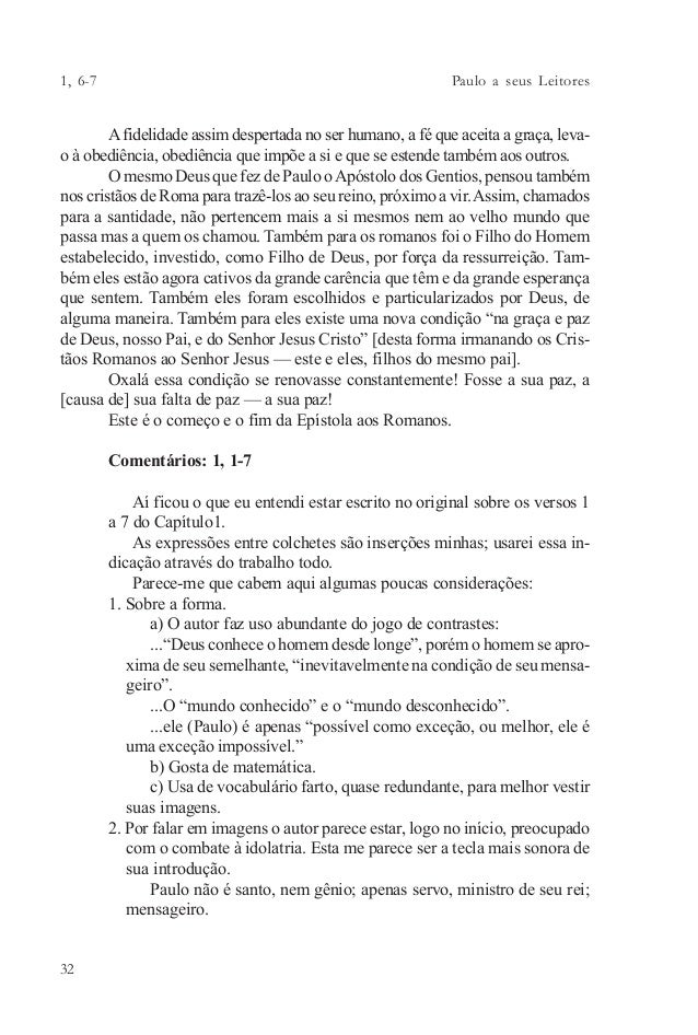33. 33. 32 Afidelidade assim despertada no ser humano, a fé que aceita a graça, leva- o à obediência, obediência que impõe a si e que se estende também aos outros. O mesmo Deus que fez de Paulo oApóstolo dos Gentios, pensou também nos cristãos de Roma para trazê-los ao seu reino, próximo a vir.Assim, chamados para a santidade, não pertencem mais a si mesmos nem ao velho mundo que passa mas a quem os chamou. Também para os romanos foi o Filho do Homem estabelecido, investido, como Filho de Deus, por força da ressurreição. Tam- bém eles estão agora cativos da grande carência que têm e da grande esperança que sentem. Também eles foram escolhidos e particularizados por Deus, de alguma maneira. Também para eles existe uma nova condição “na graça e paz de Deus, nosso Pai, e do Senhor Jesus Cristo” [desta forma irmanando os Cris- tãos Romanos ao Senhor Jesus — este e eles, filhos do mesmo pai]. Oxalá essa condição se renovasse constantemente! Fosse a sua paz, a [causa de] sua falta de paz — a sua paz! Este é o começo e o fim da Epístola aos Romanos. Comentários: 1, 1-7 Aí ficou o que eu entendi estar escrito no original sobre os versos 1 a 7 do Capítulo1. As expressões entre colchetes são inserções minhas; usarei essa in- dicação através do trabalho todo. Parece-me que cabem aqui algumas poucas considerações: 1. Sobre a forma. a) O autor faz uso abundante do jogo de contrastes: ...“Deus conhece o homem desde longe”, porém o homem se apro- xima de seu semelhante, “inevitavelmente na condição de seu mensa- geiro”. ...O “mundo conhecido” e o “mundo desconhecido”. ...ele (Paulo) é apenas “possível como exceção, ou melhor, ele é uma exceção impossível.” b) Gosta de matemática. c) Usa de vocabulário farto, quase redundante, para melhor vestir suas imagens. 2. Por falar em imagens o autor parece estar, logo no início, preocupado com o combate à idolatria. Esta me parece ser a tecla mais sonora de sua introdução. Paulo não é santo, nem gênio; apenas servo, ministro de seu rei; mensageiro. 1, 6-7 Paulo a seus Leitores