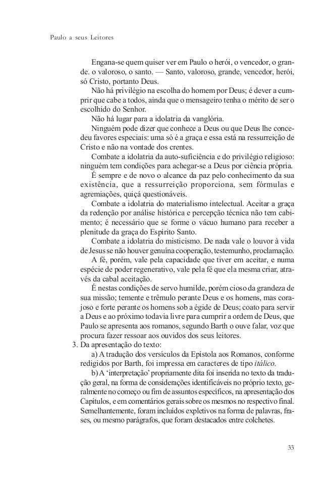 34. 34. 33 Engana-se quem quiser ver em Paulo o herói, o vencedor, o gran- de. o valoroso, o santo. — Santo, valoroso, grande, vencedor, herói, só Cristo, portanto Deus. Não há privilégio na escolha do homem por Deus; é dever a cum- prir que cabe a todos, ainda que o mensageiro tenha o mérito de ser o escolhido do Senhor. Não há lugar para a idolatria da vanglória. Ninguém pode dizer que conhece a Deus ou que Deus lhe conce- deu favores especiais: uma só é a graça e essa está na ressurreição de Cristo e não na vontade dos crentes. Combate a idolatria da auto-suficiência e do privilégio religioso: ninguém tem condições para achegar-se a Deus por ciência própria. É sempre e de novo o alcance da paz pelo conhecimento da sua existência, que a ressurreição proporciona, sem fórmulas e agremiações, quiçá questionáveis. Combate a idolatria do materialismo intelectual. Aceitar a graça da redenção por análise histórica e percepção técnica não tem cabi- mento; é necessário que se forme o vácuo humano para receber a plenitude da graça do Espírito Santo. Combate a idolatria do misticismo. De nada vale o louvor à vida de Jesus se não houver genuína cooperação, testemunho, proclamação. A fé, porém, vale pela capacidade que tiver em aceitar, e numa espécie de poder regenerativo, vale pela fé que ela mesma criar, atra- vés da cabal aceitação. É nestas condições de servo humilde, porém cioso da grandeza de sua missão; temente e trêmulo perante Deus e os homens, mas cora- joso e forte perante os homens sob a égide de Deus; coato para servir a Deus e ao próximo todavia livre para cumprir a ordem de Deus, que Paulo se apresenta aos romanos, segundo Barth o ouve falar, voz que procura fazer ressoar aos ouvidos dos seus leitores. 3. Da apresentação do texto: a) A tradução dos versículos da Epístola aos Romanos, conforme redigidos por Barth, foi impressa em caracteres de tipo itálico. b) A ‘interpretação’propriamente dita foi inserida no texto da tradu- ção geral, na forma de considerações identificáveis no próprio texto, ge- ralmente no começo ou fim de assuntos específicos, na apresentação dos Capítulos, e em comentários gerais sobre os mesmos no respectivo final. Semelhantemente, foram incluídos expletivos na forma de palavras, fra- ses, ou mesmo parágrafos, que foram destacados entre colchetes. Paulo a seus Leitores