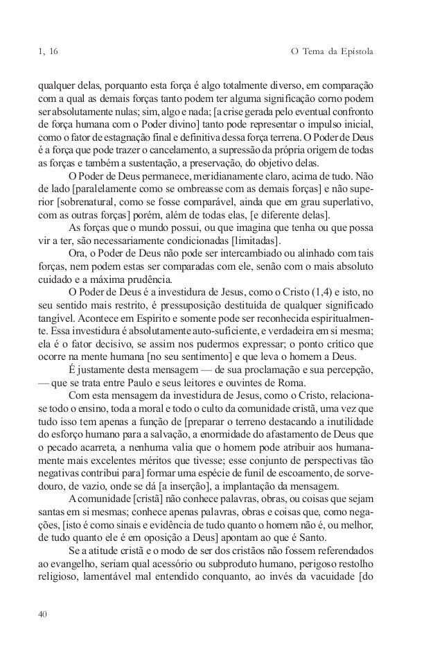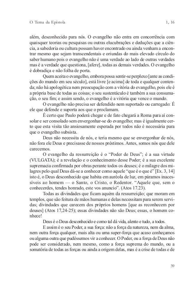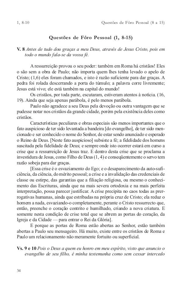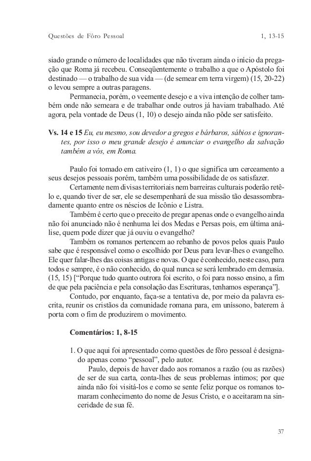 38. 38. 37 siado grande o número de localidades que não tiveram ainda o início da prega- ção que Roma já recebeu. Conseqüentemente o trabalho a que o Apóstolo foi destinado — o trabalho de sua vida — (de semear em terra virgem) (15, 20-22) o levou sempre a outras paragens. Permanecia, porém, o veemente desejo e a viva intenção de colher tam- bém onde não semeara e de trabalhar onde outros já haviam trabalhado. Até agora, pela vontade de Deus (1, 10) o desejo ainda não pôde ser satisfeito. Vs. 14 e 15 Eu, eu mesmo, sou devedor a gregos e bárbaros, sábios e ignoran- tes, por isso o meu grande desejo é anunciar o evangelho da salvação também a vós, em Roma. Paulo foi tomado em cativeiro (1, 1) o que significa um cerceamento a seus desejos pessoais porém, também uma possibilidade de os satisfazer. Certamente nem divisas territoriais nem barreiras culturais poderão retê- lo e, quando tiver de ser, ele se desempenhará de sua missão tão desassombra- damente quanto entre os néscios de Icônio e Listra. Também é certo que o preceito de pregar apenas onde o evangelho ainda não foi anunciado não é nenhuma lei dos Medas e Persas pois, em última aná- lise, quem pode dizer que já ouviu o evangelho? Também os romanos pertencem ao rebanho de povos pelos quais Paulo sabe que é responsável como o escolhido por Deus para levar-lhes o evangelho. Ele quer falar-lhes das coisas antigas e novas. O que é conhecido, neste caso, para todos e sempre, é o não conhecido, do qual nunca se será lembrado em demasia. (15, 15) [“Porque tudo quanto outrora foi escrito, o foi para nosso ensino, a fim de que pela paciência e pela consolação das Escrituras, tenhamos esperança”]. Contudo, por enquanto, faça-se a tentativa de, por meio da palavra es- crita, reunir os cristãos da comunidade romana para, em uníssono, baterem à porta com o fim de produzirem o movimento. Comentários: 1, 8-15 1. O que aqui foi apresentado como questões de fôro pessoal é designa- do apenas como “pessoal”, pelo autor. Paulo, depois de haver dado aos romanos a razão (ou as razões) de ser de sua carta, conta-lhes de seus problemas íntimos; por que ainda não foi visitá-los e como se sente feliz porque os romanos to- maram conhecimento do nome de Jesus Cristo, e o aceitaram na sin- ceridade de sua fé. Questões de Fôro Pessoal 1, 13-15