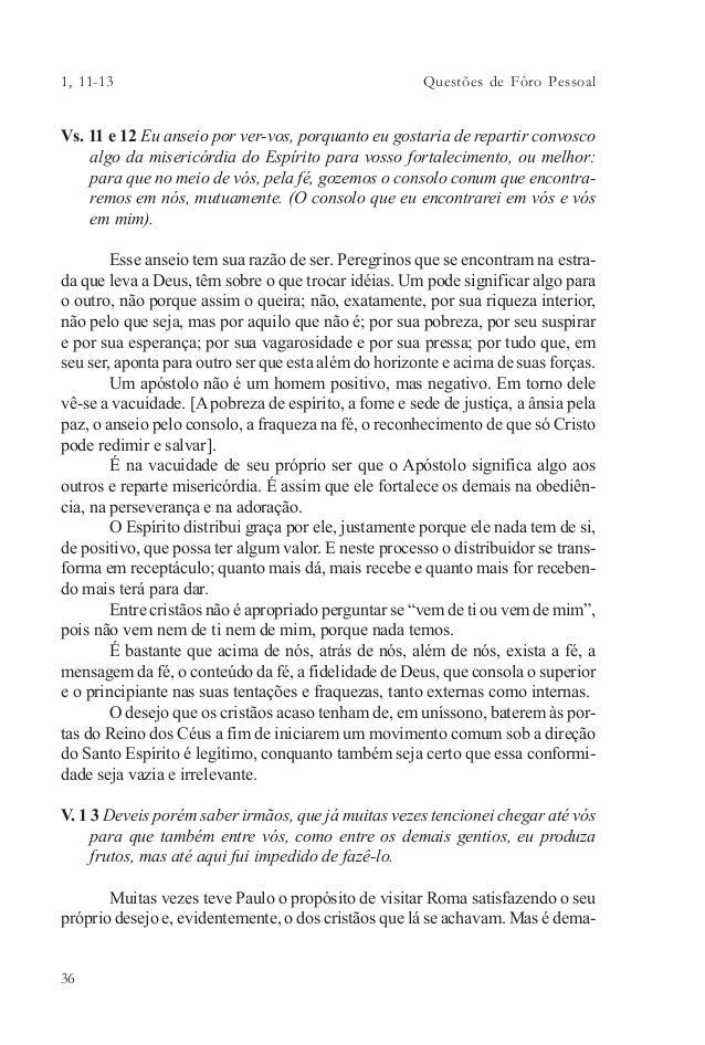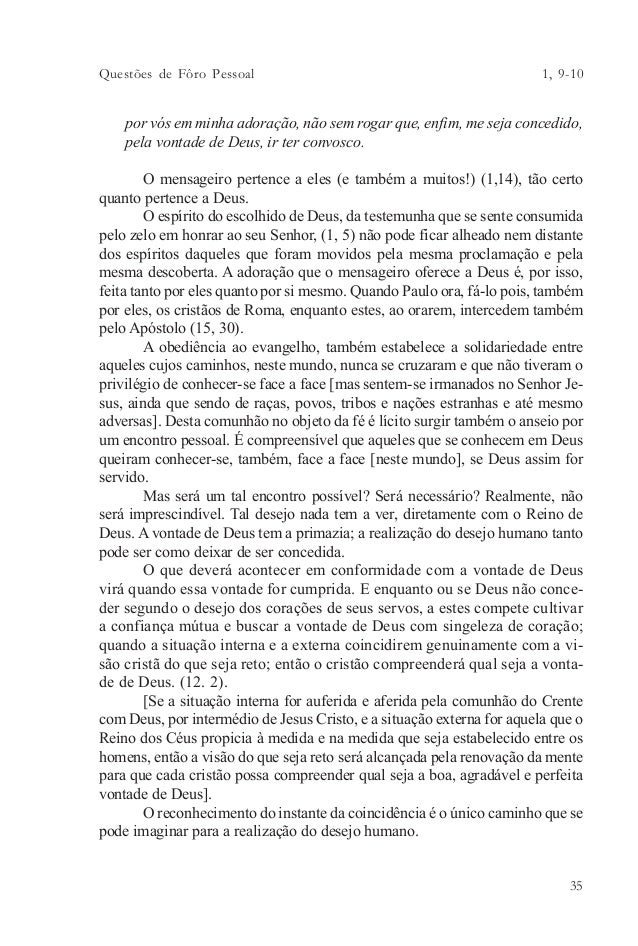 36. 36. 35 por vós em minha adoração, não sem rogar que, enfim, me seja concedido, pela vontade de Deus, ir ter convosco. O mensageiro pertence a eles (e também a muitos!) (1,14), tão certo quanto pertence a Deus. O espírito do escolhido de Deus, da testemunha que se sente consumida pelo zelo em honrar ao seu Senhor, (1, 5) não pode ficar alheado nem distante dos espíritos daqueles que foram movidos pela mesma proclamação e pela mesma descoberta. A adoração que o mensageiro oferece a Deus é, por isso, feita tanto por eles quanto por si mesmo. Quando Paulo ora, fá-lo pois, também por eles, os cristãos de Roma, enquanto estes, ao orarem, intercedem também pelo Apóstolo (15, 30). A obediência ao evangelho, também estabelece a solidariedade entre aqueles cujos caminhos, neste mundo, nunca se cruzaram e que não tiveram o privilégio de conhecer-se face a face [mas sentem-se irmanados no Senhor Je- sus, ainda que sendo de raças, povos, tribos e nações estranhas e até mesmo adversas]. Desta comunhão no objeto da fé é lícito surgir também o anseio por um encontro pessoal. É compreensível que aqueles que se conhecem em Deus queiram conhecer-se, também, face a face [neste mundo], se Deus assim for servido. Mas será um tal encontro possível? Será necessário? Realmente, não será imprescindível. Tal desejo nada tem a ver, diretamente com o Reino de Deus. A vontade de Deus tem a primazia; a realização do desejo humano tanto pode ser como deixar de ser concedida. O que deverá acontecer em conformidade com a vontade de Deus virá quando essa vontade for cumprida. E enquanto ou se Deus não conce- der segundo o desejo dos corações de seus servos, a estes compete cultivar a confiança mútua e buscar a vontade de Deus com singeleza de coração; quando a situação interna e a externa coincidirem genuinamente com a vi- são cristã do que seja reto; então o cristão compreenderá qual seja a vonta- de de Deus. (12. 2). [Se a situação interna for auferida e aferida pela comunhão do Crente com Deus, por intermédio de Jesus Cristo, e a situação externa for aquela que o Reino dos Céus propicia à medida e na medida que seja estabelecido entre os homens, então a visão do que seja reto será alcançada pela renovação da mente para que cada cristão possa compreender qual seja a boa, agradável e perfeita vontade de Deus]. O reconhecimento do instante da coincidência é o único caminho que se pode imaginar para a realização do desejo humano. Questões de Fôro Pessoal 1, 9-10