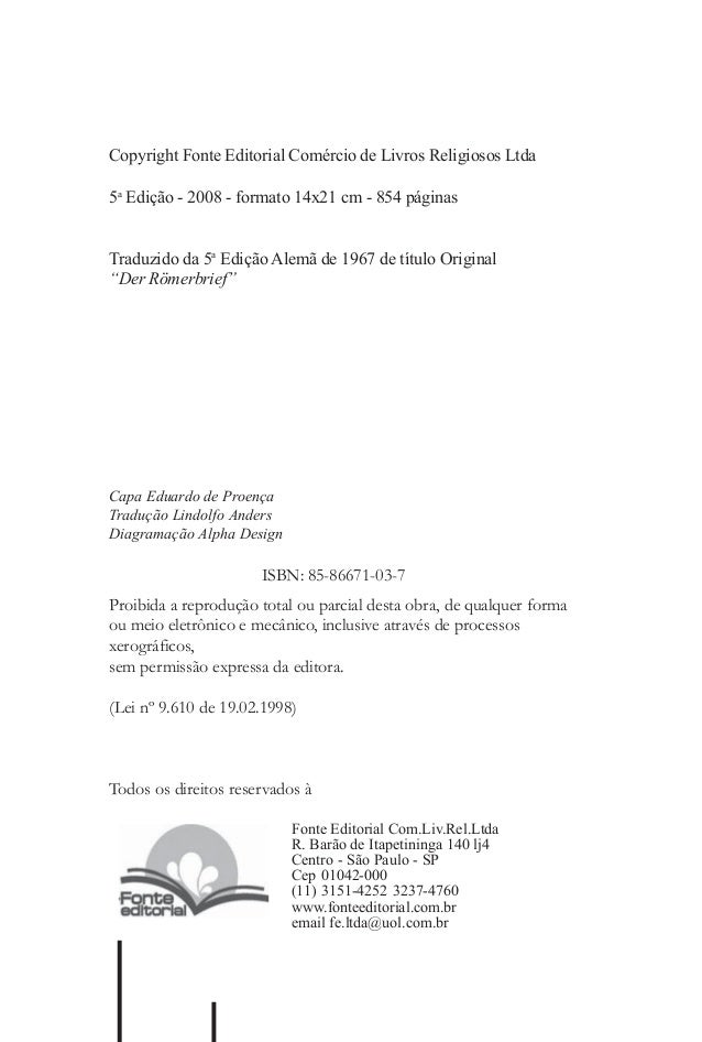 3. 3. Copyright Fonte Editorial Comércio de Livros Religiosos Ltda 5a Edição - 2008 - formato 14x21 cm - 854 páginas Traduzido da 5a Edição Alemã de 1967 de título Original “Der Römerbrief” Fonte Editorial Com.Liv.Rel.Ltda R. Barão de Itapetininga 140 lj4 Centro - São Paulo - SP Cep 01042-000 (11) 3151-4252 3237-4760 www.fonteeditorial.com.br email fe.ltda@uol.com.br Proibida a reprodução total ou parcial desta obra, de qualquer forma ou meio eletrônico e mecânico, inclusive através de processos xerográficos, sem permissão expressa da editora. (Lei nº 9.610 de 19.02.1998) Todos os direitos reservados à ISBN: 85-86671-03-7 Capa Eduardo de Proença Tradução Lindolfo Anders Diagramação Alpha Design