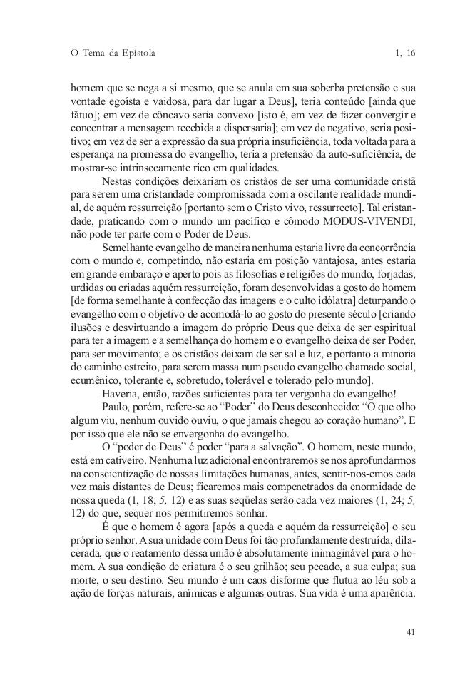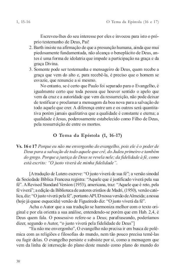 39. 39. 38 Escreveu-lhes do seu interesse por eles e invocou para isto o pró- prio testemunho de Deus, Pai! 2. Barth insiste na afirmação de que a presunção humana, ainda que mui piedosamente fundamentada, não alcança o beneplácito de Deus, an- tes é uma forma de idolatria que impede a participação na graça e da graça Divina. 3. Somente pode ser testemunha e mensageiro de Deus, quem recebe a graça que vem do alto e, para recebê-la, é preciso que o homem se esvazie, que renuncie a si mesmo. No entanto, se é certo que Paulo foi separado para o Evangelho, é igualmente certo que toda pessoa que houver sentido o apelo que vem da cruz e a autoridade que vem da ressurreição, não pode deixar de testificar e proclamar a mensagem da boa nova para a salvação de todo aquele que crer. A diferença entre um e os outros será quantita- tiva porém jamais qualitativa que a qualidade é constante e eterna; a qualidade é Jesus, poderosamente estabelecido como Filho de Deus, pela ressurreição de entre os mortos. O Tema da Epístola (1, 16-17) Vs. 16 e 17 Porque eu não me envergonho do evangelho, pois ele é o poder de Deus para a salvação de todo aquele que crê, do Judeu primeiro e também do grego. Porque a justiça de Deus se revela nele; da fidelidade à fé, como está escrito: “O justo viverá de minha fidelidade”. [Atradução de Lutero escreve: “O justo viverá de sua fé”; a versão sinodal da Sociedade Bíblica Francesa registra: “Aquele que é justificado viverá pela sua fé”. A Revised Standard Version (1953), americana, traz: “Aquele que é reto, pela fé viverá”; a edição da Biblioteca de autores cristãos de Madri, (1950), versão cató- lica, diz: “O justo viverá pela fé”, portantoAPUD nossa versão deAlmeida; a nossa (hoje já quase esquecida) versão de Figueiredo diz: “O justo viverá da fé”. Acha o Autor que a sua tradução se harmoniza melhor com o texto ori- ginal e por ela orienta a sua análise, entendendo-se porém que em Hab. 2,4, é Deus quem fala. O possessivo refere-se a Deus; parafraseando, poderíamos dizer, segundo o Autor, “o justo viverá pela fidelidade de Deus”] “Eu não me envergonho”, O evangelho não precisa ir em busca de polê- mica com as religiões e filosofias do mundo, nem tão pouco precisa temê-las ou fugir delas. O evangelho persiste e subsiste por si, como a mensagem que vem da linha de interseção do plano deste mundo como plano do mundo do 1, 15-16 O Tema da Epístola (16 e 17)