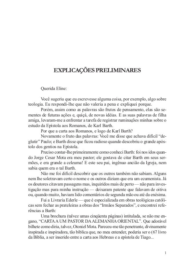 4. 4. 1 EXPLICAÇÕESPRELIMINARES Querida Eline: Você sugeriu que eu escrevesse alguma coisa, por exemplo, algo sobre teologia. Eu respondi-lhe que não valeria a pena e expliquei porque. Porém, assim como as palavras são frutos de pensamento, elas são se- mentes de futuras ações e, quiçá, de novas idéias. E as suas palavras de filha amiga, levaram-me a enfrentar a tarefa de registrar ruminações minhas sobre o estudo da Epístola aos Romanos, de Karl Barth. Por que a carta aos Romanos, e logo de Karl Barth? Novamente o fruto das palavras: Você me disse que achava difícil “de- glutir” Paulo; e Barth disse que ficou radioso quando descobriu o grande após- tolo dos gentios na Epístola. Preciso contar-lhe primeiramente como conheci Barth: foi nos idos quan- do Jorge Cesar Mota era meu pastor; ele gostava de citar Barth em seus ser- mões, e era grande a celeuma! E este seu pai, ingênuo ancião da Igreja, nem sabia quem era o tal Barth. Não me foi difícil descobrir que os outros também não sabiam. Alguns nem lhe soletravam certo o nome e os outros diziam que era um ecumenista. Já os doutores citavam passagens mas, inquiridos mais de perto — não para inves- tigação mas para minha instrução — deixaram patente que falavam de oitiva ou, quando muito, haviam lido comentários de segunda mão ou até da enésima. Fui a Livraria Ederle — que é especializada em obras teológicas católi- cas sem fechar as prateleiras a obras dos “Irmãos Separados”, e encontrei refe- rências a Barth: Uma brochura (talvez umas cinqüenta páginas) intitulada, se não me en- gano, “CARTAA UM PASTOR DAALEMANHA ORIENTAL”. Que adorável bilhete como diria, talvez, Otoniel Mota. Pareceu-me tão penetrante, divinamente inspirada e inspiradora, tão bíblica que, no meu entender, poderia ser o (67 livro da Bíblia, a ser inserido entre a carta aos Hebreus e a epístola de Tiago...