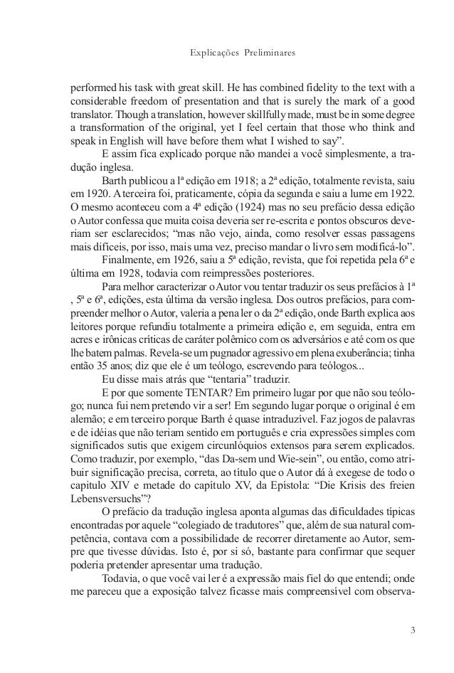 6. 6. 3 performed his task with great skill. He has combined fidelity to the text with a considerable freedom of presentation and that is surely the mark of a good translator. Though a translation, however skillfully made, must be in some degree a transformation of the original, yet I feel certain that those who think and speak in English will have before them what I wished to say”. E assim fica explicado porque não mandei a você simplesmente, a tra- dução inglesa. Barth publicou a lª edição em 1918; a 2ª edição, totalmente revista, saiu em 1920. Aterceira foi, praticamente, cópia da segunda e saiu a lume em 1922. O mesmo aconteceu com a 4ª edição (1924) mas no seu prefácio dessa edição oAutor confessa que muita coisa deveria ser re-escrita e pontos obscuros deve- riam ser esclarecidos; “mas não vejo, ainda, como resolver essas passagens mais difíceis, por isso, mais uma vez, preciso mandar o livro sem modificá-lo”. Finalmente, em 1926, saiu a 5ª edição, revista, que foi repetida pela 6ª e última em 1928, todavia com reimpressões posteriores. Para melhor caracterizar oAutor vou tentar traduzir os seus prefácios à 1ª , 5ª e 6ª, edições, esta última da versão inglesa. Dos outros prefácios, para com- preender melhor oAutor, valeria a pena ler o da 2ª edição, onde Barth explica aos leitores porque refundiu totalmente a primeira edição e, em seguida, entra em acres e irônicas críticas de caráter polêmico com os adversários e até com os que lhe batem palmas. Revela-se um pugnador agressivo em plena exuberância; tinha então 35 anos; diz que ele é um teólogo, escrevendo para teólogos... Eu disse mais atrás que “tentaria” traduzir. E por que somente TENTAR? Em primeiro lugar por que não sou teólo- go; nunca fui nem pretendo vir a ser! Em segundo lugar porque o original é em alemão; e em terceiro porque Barth é quase intraduzível. Faz jogos de palavras e de idéias que não teriam sentido em português e cria expressões simples com significados sutis que exigem circunlóquios extensos para serem explicados. Como traduzir, por exemplo, “das Da-sem und Wie-sein”, ou então, como atri- buir significação precisa, correta, ao título que o Autor dá à exegese de todo o capitulo XIV e metade do capítulo XV, da Epístola: “Die Krisis des freien Lebensversuchs”? O prefácio da tradução inglesa aponta algumas das dificuldades típicas encontradas por aquele “colegiado de tradutores” que, além de sua natural com- petência, contava com a possibilidade de recorrer diretamente ao Autor, sem- pre que tivesse dúvidas. Isto é, por si só, bastante para confirmar que sequer poderia pretender apresentar uma tradução. Todavia, o que você vai ler é a expressão mais fiel do que entendi; onde me pareceu que a exposição talvez ficasse mais compreensível com observa- Explicações Preliminares