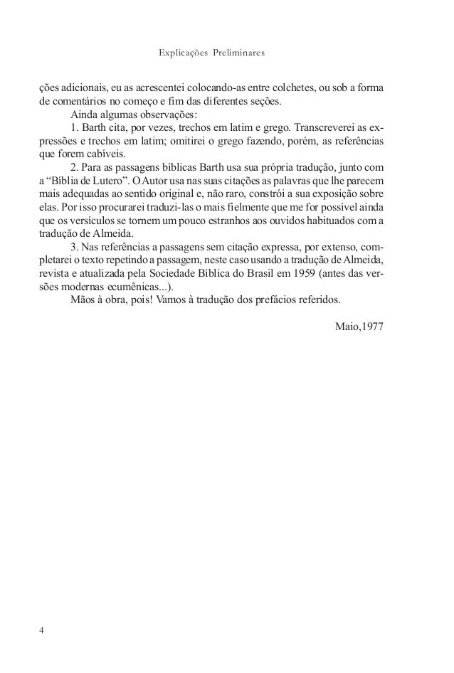 7. 7. 4 ções adicionais, eu as acrescentei colocando-as entre colchetes, ou sob a forma de comentários no começo e fim das diferentes seções. Ainda algumas observações: 1. Barth cita, por vezes, trechos em latim e grego. Transcreverei as ex- pressões e trechos em latim; omitirei o grego fazendo, porém, as referências que forem cabíveis. 2. Para as passagens bíblicas Barth usa sua própria tradução, junto com a “Bíblia de Lutero”. OAutor usa nas suas citações as palavras que lhe parecem mais adequadas ao sentido original e, não raro, constrói a sua exposição sobre elas. Por isso procurarei traduzi-las o mais fielmente que me for possível ainda que os versículos se tornem um pouco estranhos aos ouvidos habituados com a tradução de Almeida. 3. Nas referências a passagens sem citação expressa, por extenso, com- pletarei o texto repetindo a passagem, neste caso usando a tradução deAlmeida, revista e atualizada pela Sociedade Bíblica do Brasil em 1959 (antes das ver- sões modernas ecumênicas...). Mãos à obra, pois! Vamos à tradução dos prefácios referidos. Maio,1977 Explicações Preliminares