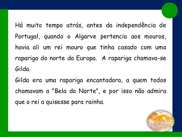 2. 2. Há muito tempo atrás, antes da independência de Portugal, quando o Algarve pertencia aos mouros, havia ali um rei mouro que tinha casado com uma rapariga do norte da Europa. A rapariga chamava-se Gilda. Gilda era uma rapariga encantadora, a quem todos chamavam a "Bela do Norte", e por isso não admira que o rei a quisesse para rainha.