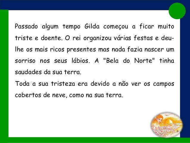 3. 3. Passado algum tempo Gilda começou a ficar muito triste e doente. O rei organizou várias festas e deu- lhe os mais ricos presentes mas nada fazia nascer um sorriso nos seus lábios. A "Bela do Norte" tinha saudades da sua terra. Toda a sua tristeza era devido a não ver os campos cobertos de neve, como na sua terra.