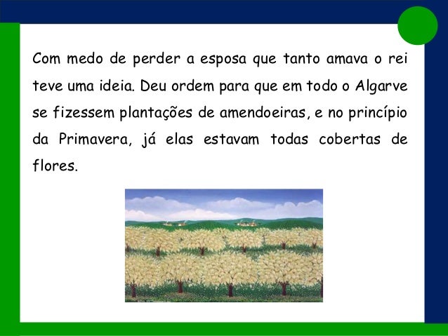 4. 4. Com medo de perder a esposa que tanto amava o rei teve uma ideia. Deu ordem para que em todo o Algarve se fizessem plantações de amendoeiras, e no princípio da Primavera, já elas estavam todas cobertas de flores.