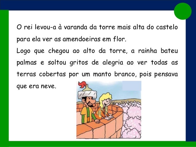 5. 5. O rei levou-a à varanda da torre mais alta do castelo para ela ver as amendoeiras em flor. Logo que chegou ao alto da torre, a rainha bateu palmas e soltou gritos de alegria ao ver todas as terras cobertas por um manto branco, pois pensava que era neve.