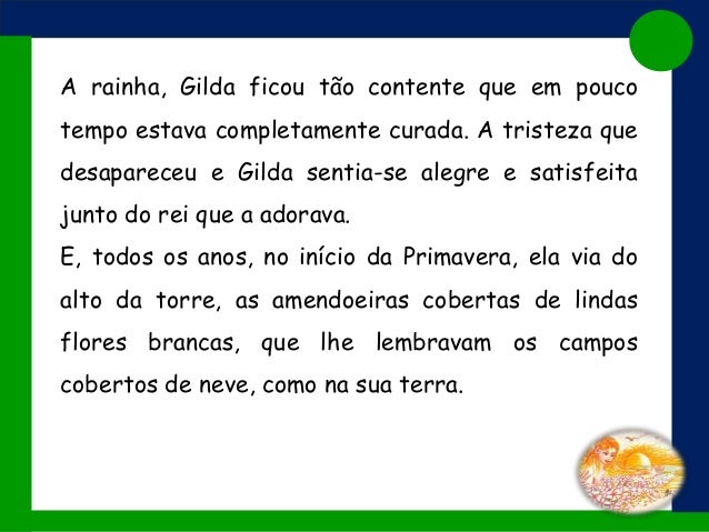 6. 6. A rainha, Gilda ficou tão contente que em pouco tempo estava completamente curada. A tristeza que desapareceu e Gilda sentia-se alegre e satisfeita junto do rei que a adorava. E, todos os anos, no início da Primavera, ela via do alto da torre, as amendoeiras cobertas de lindas flores brancas, que lhe lembravam os campos cobertos de neve, como na sua terra.