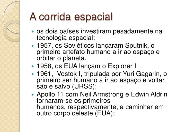 11. 11. A corrida espacial os dois países investiram pesadamente na  tecnologia espacial; 1957, os Soviéticos lançaram Sputnik, o  primeiro artefato humano a ir ao espaço e orbitar o planeta. 1958, os EUA lançam o Explorer I  1961, Vostok I, tripulada por Yuri Gagarin, o  primeiro ser humano a ir ao espaço e voltar são e salvo (URSS); Apollo 11 com Neil Armstrong e Edwin Aldrin  tornaram-se os primeiros humanos, respectivamente, a caminhar em outro corpo celeste (EUA);