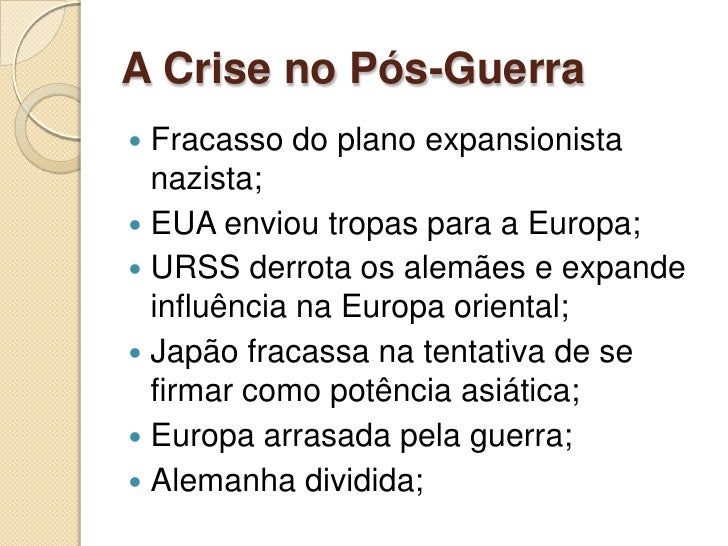 2. 2. A Crise no Pós-Guerra Fracasso do plano expansionista  nazista;  EUA enviou tropas para a Europa;  URSS derrota os alemães e expande influência na Europa oriental;  Japão fracassa na tentativa de se firmar como potência asiática;  Europa arrasada pela guerra;  Alemanha dividida;