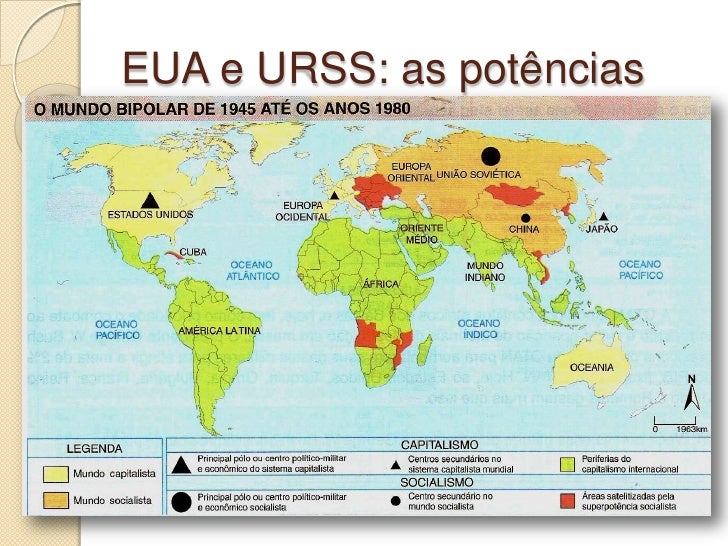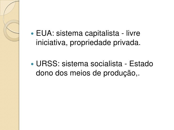 6. 6. EUA: sistema capitalista - livre  iniciativa, propriedade privada. URSS: sistema socialista - Estado  dono dos meios de produção,.