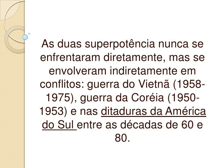 7. 7. As duas superpotência nunca se enfrentaram diretamente, mas se envolveram indiretamente em conflitos: guerra do Vietnã (1958- 1975), guerra da Coréia (1950- 1953) e nas ditaduras da América do Sul entre as décadas de 60 e 80.