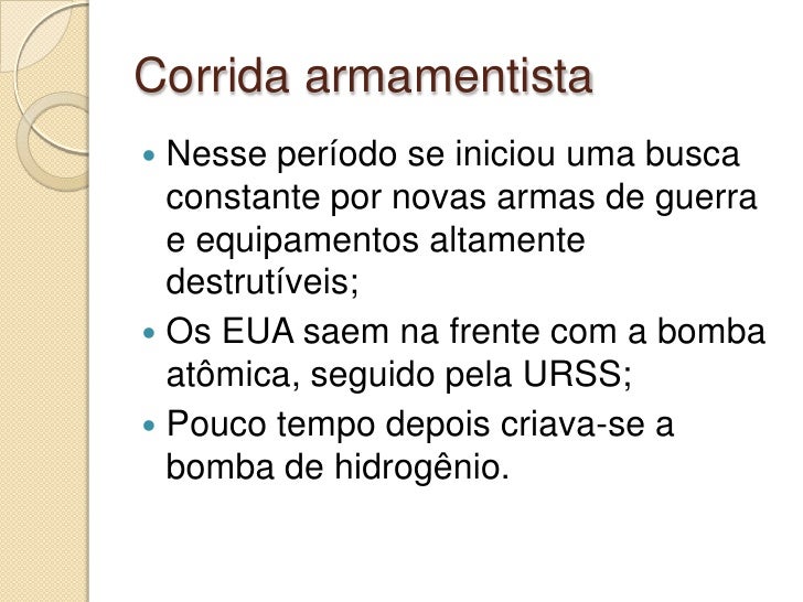 9. 9. Corrida armamentista Nesse período se iniciou uma busca  constante por novas armas de guerra e equipamentos altamente destrutíveis;  Os EUA saem na frente com a bomba atômica, seguido pela URSS;  Pouco tempo depois criava-se a bomba de hidrogênio.